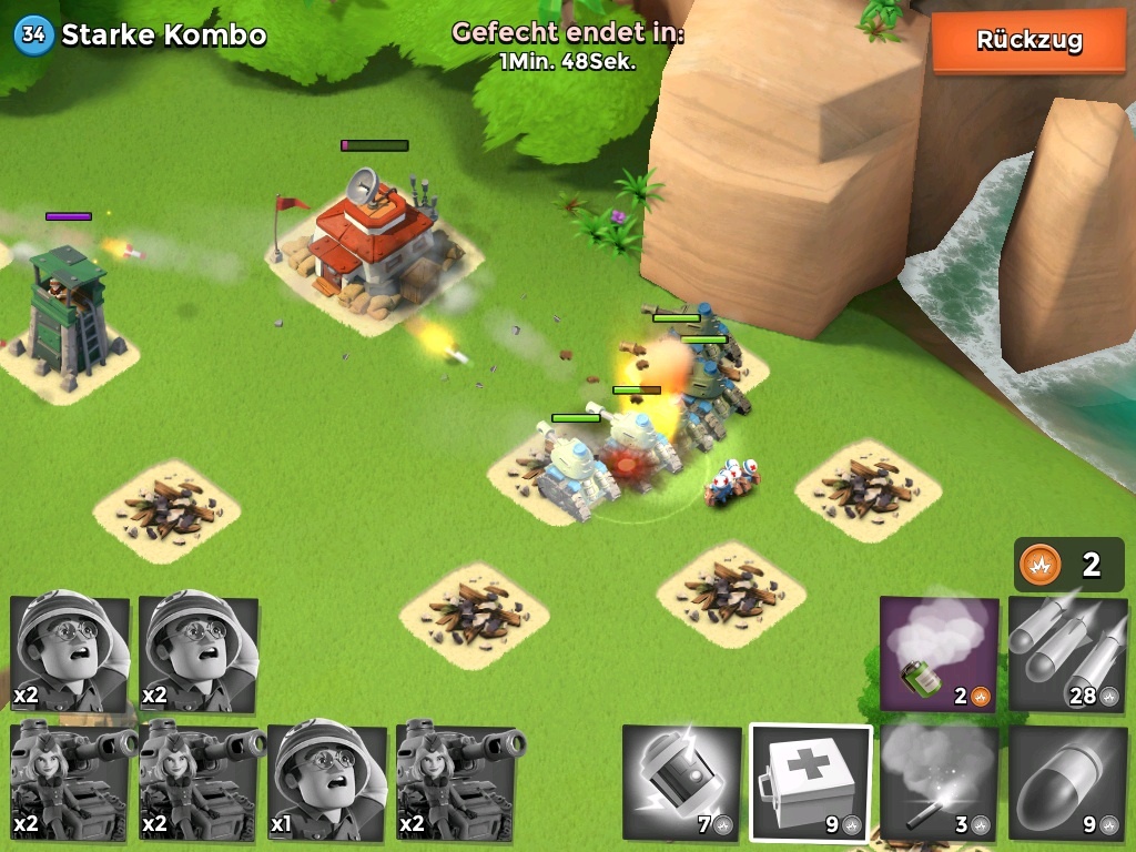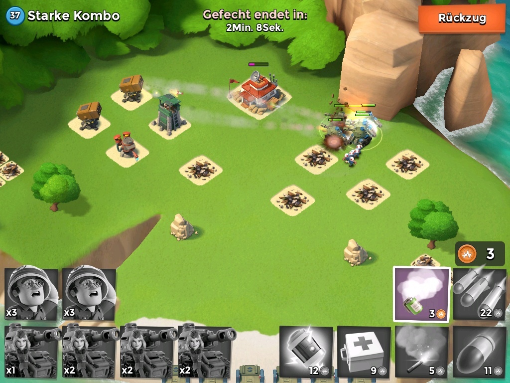 Kostet 8 und bringt 24, also hatte ich nun 67. Hiermit bekomme ich die linke Boom mit 2 Sperrfeuer und 2 Artillerie tatsächlich platt. Kostet 42, bleiben 25. Hiervon gehen 16 Für die Panzer ab, bleiben noch 9. Das entspricht genau einer Flare und einer Schock für die 2. Boom, die dann mit den Panzersalven ausgemerzt werden. Allerdings haben die einen Bruchteil zu lange gebraucht, sodass ein Panzer das Zeitliche segnete.