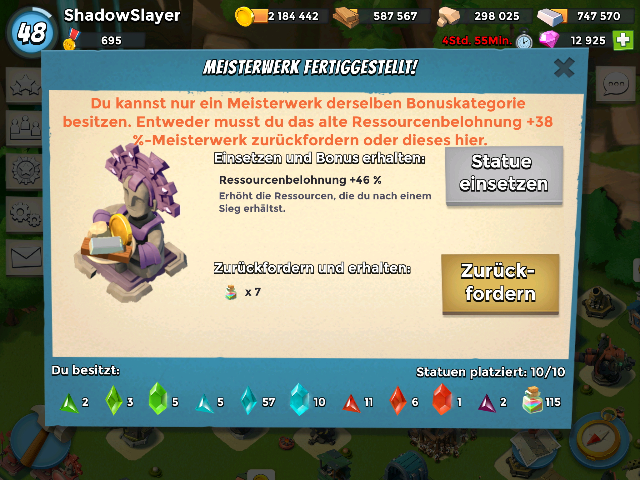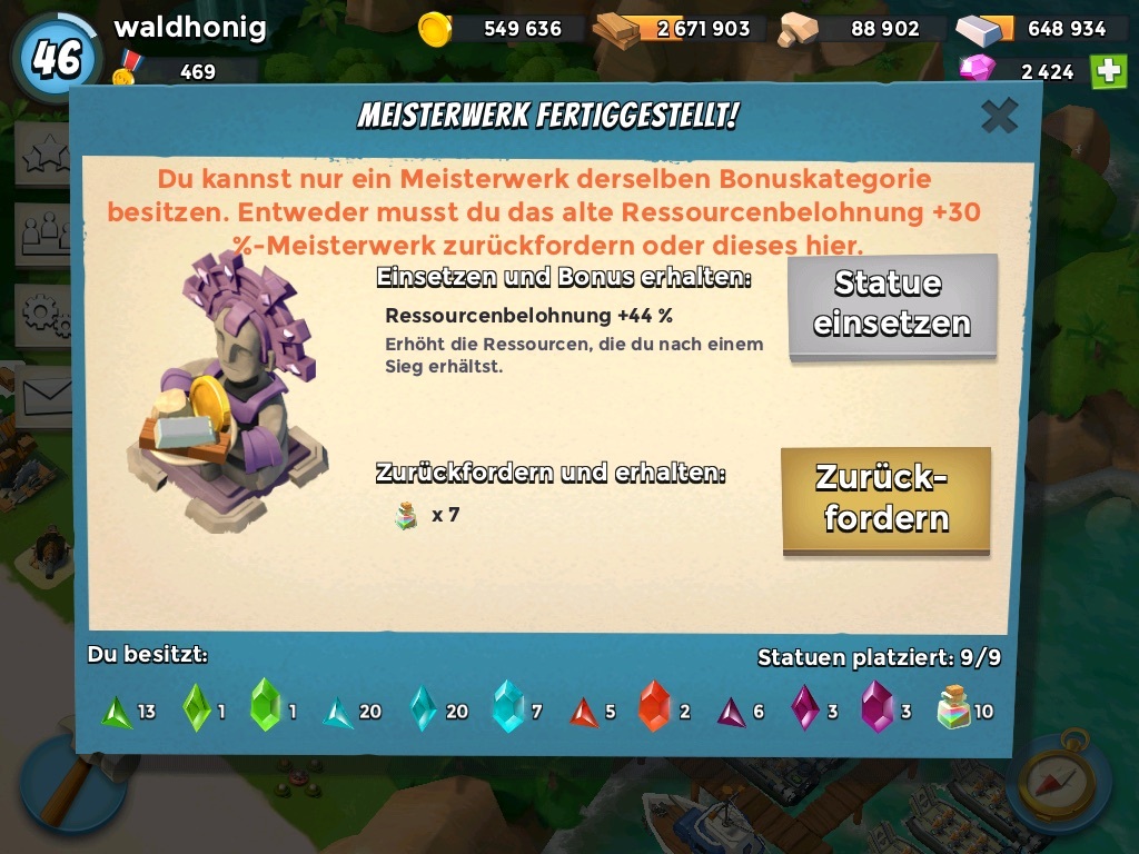 Heute morgen war ein Resi Belohnung MW 50% fertig nun gut da musste dann das 46% weichen Resis habe ich eh nie wirklich Mangel und endlich ich konnte meinen Energiewächter von 11 auf 13 verbessern Juhu 8)