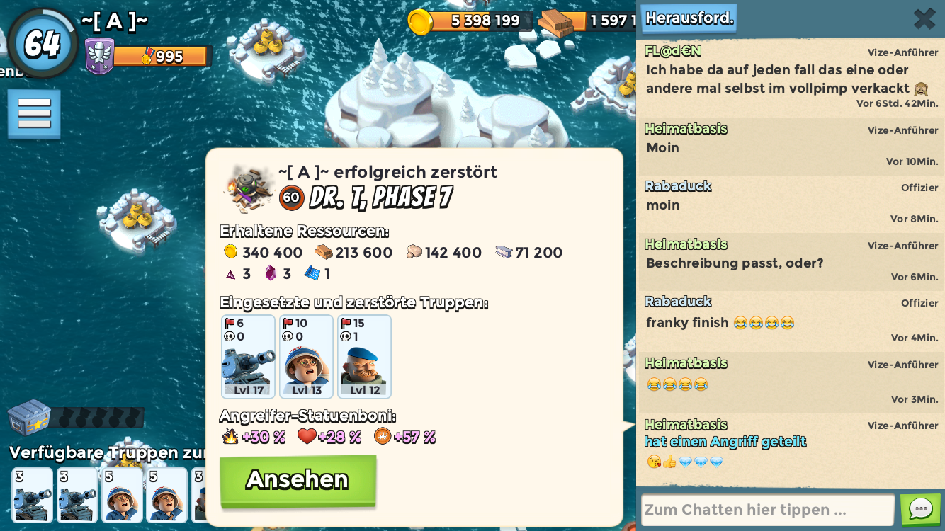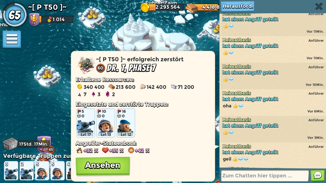 Hab dafür 4 Versuche gebraucht...Eingesetzte Truppen waren nur Zookas (71 Stück mit Lv16)