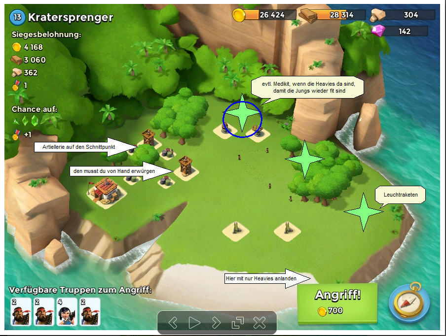 Wenn du zu wenig Energie hast, musst du evtl. schon bei der zweiten Leuchtrakete raus und dich mit dem Schützenturm rumärgern.Alternativ zu diesem Plan einfach mit Heavies und Zookies von unten rechts reingehen, Kanone rechts vorher schrotten. Die Heavies halten die Minen aus und die zwei Schützentürme kann man so auch schaffen. Der obere Plan ist aber eleganter. Und man muss sich nicht mit der Kanone rumärgern (btw. nicht zu weit nach rechts rauskommen, sonst erreicht die dich)