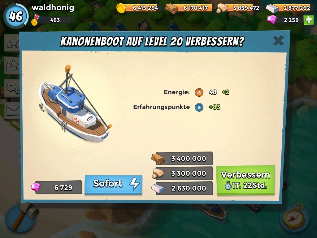 #873 HQ ist soeben auf Level 12 gestiegen und momentan läuft das Böötchen auf Level 11 und Ari wird auch gelevelt- denn das Gold will ja auch ausgegeben werden- und jetzt werden dann bis Samstag die Lager gelevelt, weil ich sonst keine LC's und auch mein Kanonenboot nicht weiter hochleveln kann.