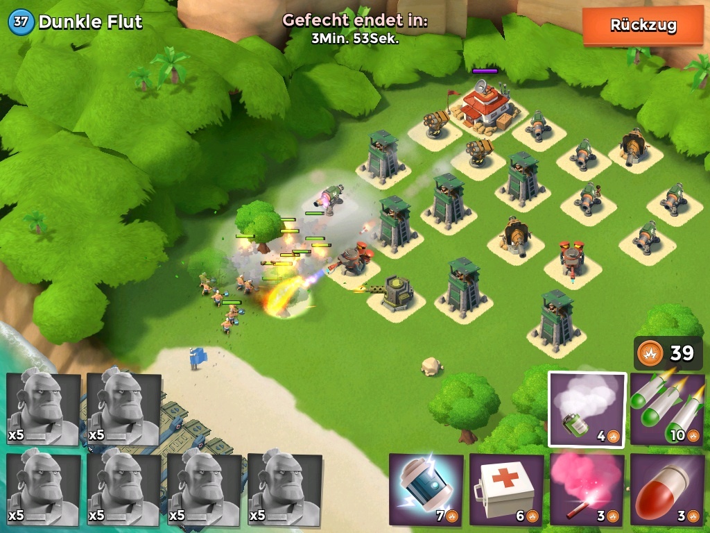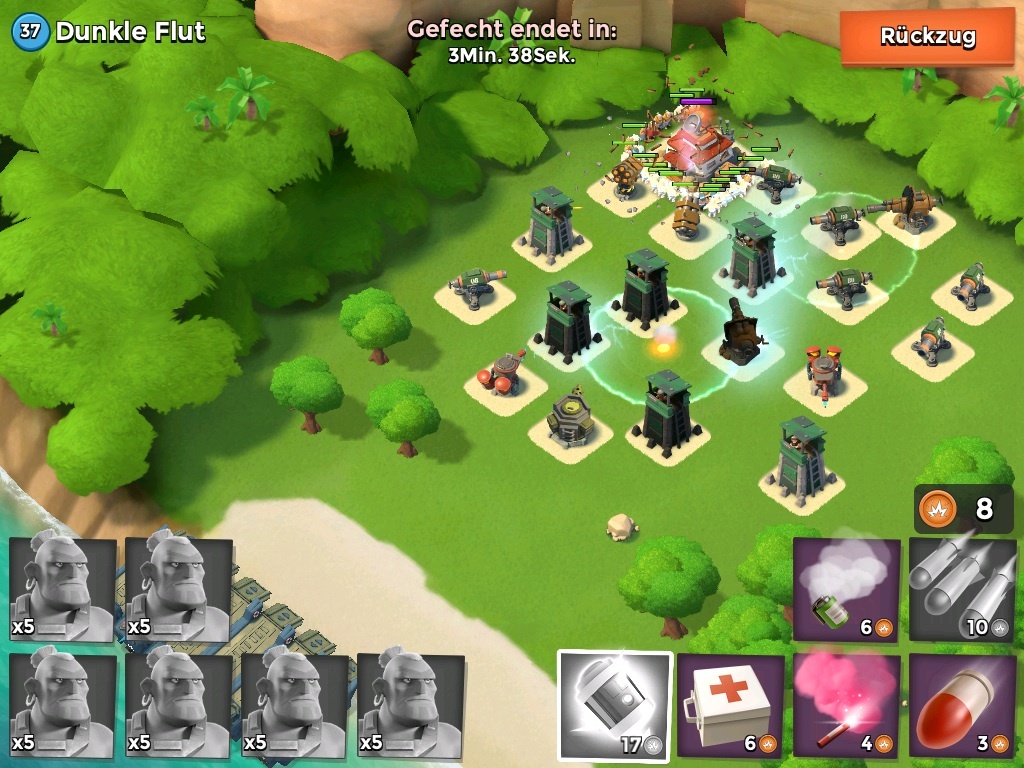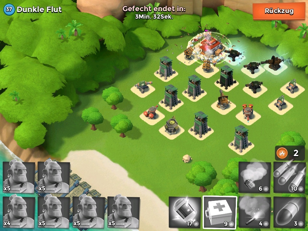 Das HQ hat in dem Fall 70.000 Trefferpunkte und das umstehende Zeug lässt sich prima schocken. Die Basis gibt es auch in kleiner, aber meist räume ich die mit den Bürstenköpfen weg. In dem Fall ist es auch nicht sooo wichtig, was da an Level drumherum steht. Wie gesagt, in einer weiteren Lösung komme ich darauf zurück.