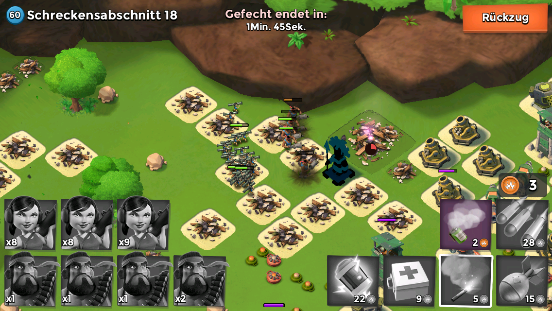 Dank Kriegsheld-Award habe ich auch Dias, um das nach dem Start zu bewerfen und mir noch ein Truppenupdate zu gönnen. Wenn das Geld reicht, gehen die Warrior auf max. Und wenn nicht, dann findet sich in Rauch, Leuchte oder Medikit sicher ein adäquater Ersatz