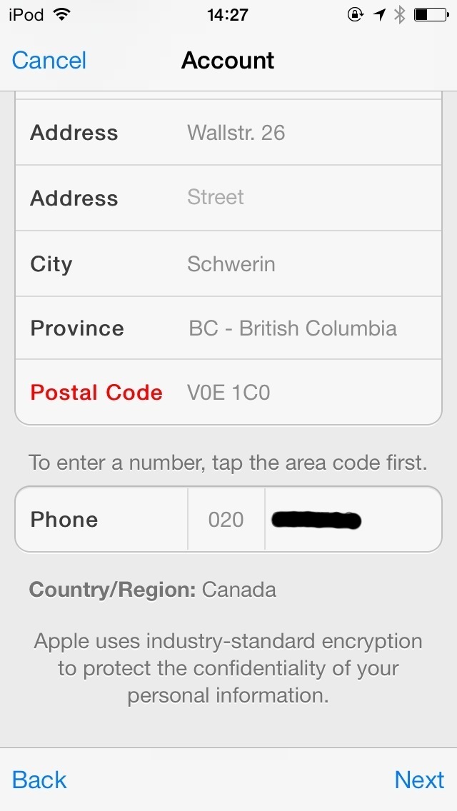 Die Postleitzahl muss exakt stimmen. Ich habe den Post-Code "V0E 1C0" gewählt.