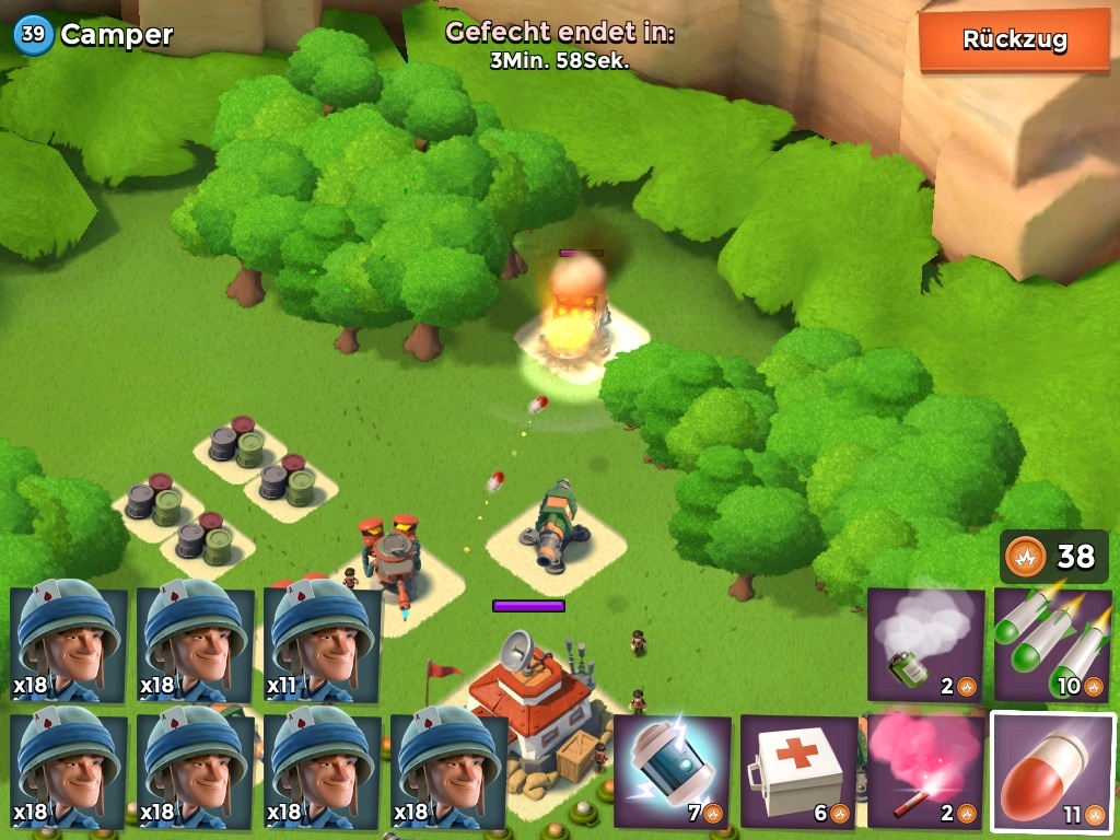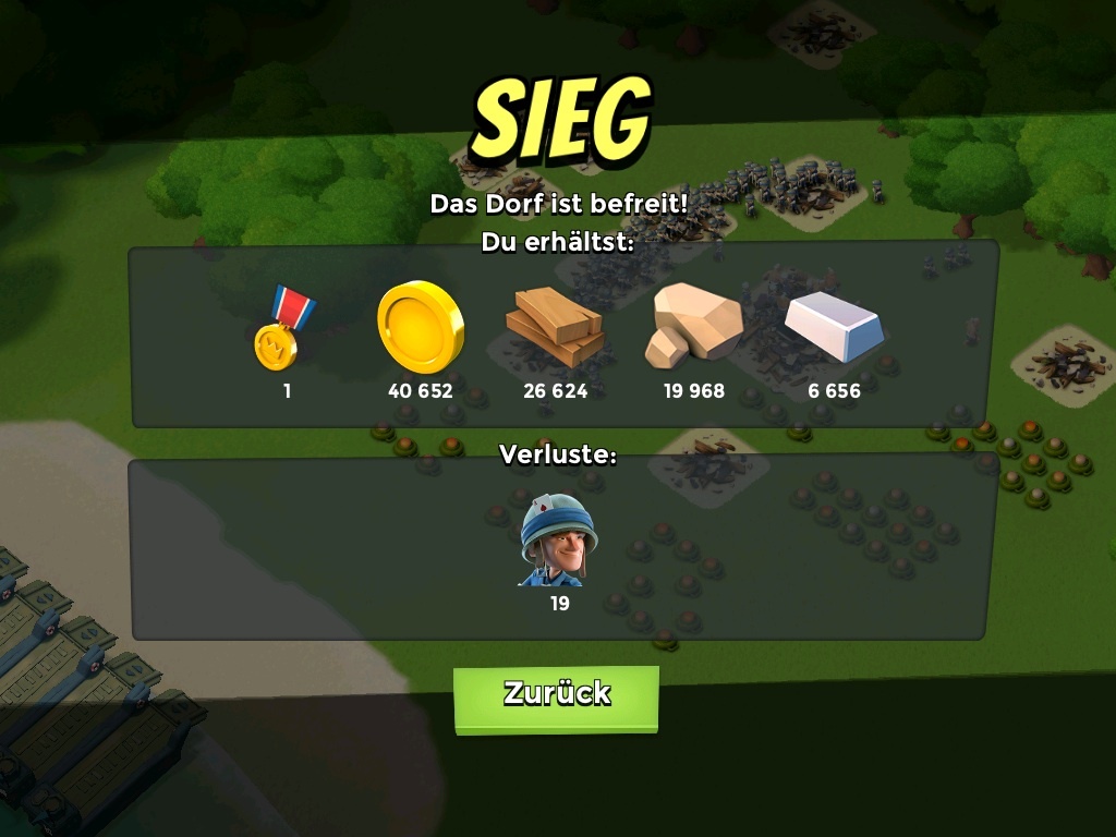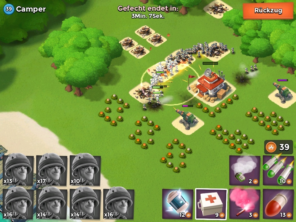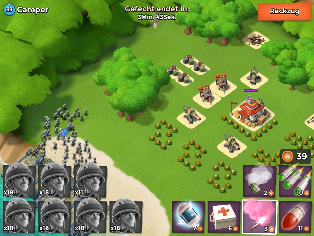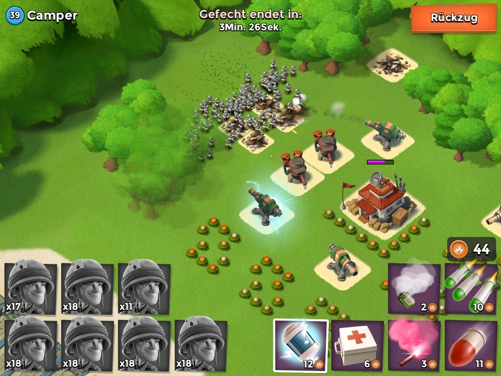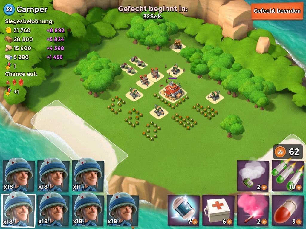 Auf der Insel haben wir es mit Kanone Level 19 (9.000 Trefferpunkte), Raketenwerfer 11 und dem Rest, inklusive HQ Level 19 oder 20. D.h., das Hauptquartier hat 130.000 Trefferpunkte.