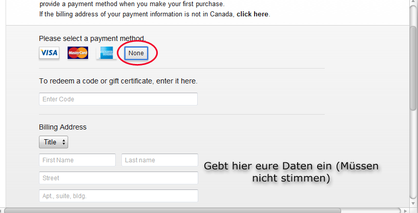 Als Bezahlmethode gebt ihr "none" an, dann gebt ihr die erforderlichen Daten ein