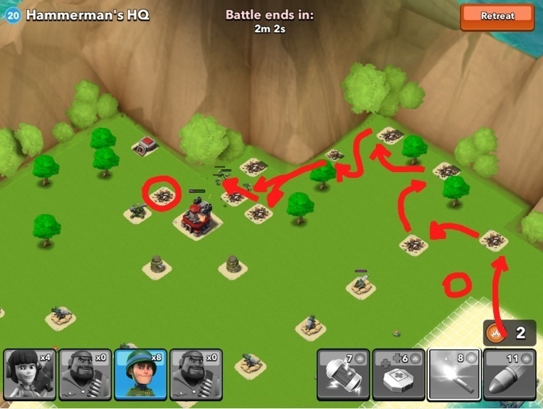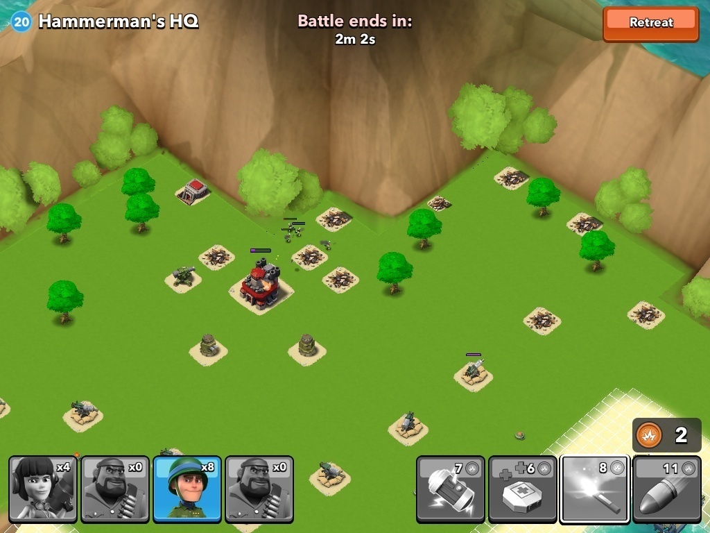 Strategie: vorletzte Mine rechts sprengen (wichtig! Die Bazookas latschen da immer drueber und puff!) und per Schiff die 2. Cannon von links am HQ vernichten. Rechts unten anlanden und beide MPs wegblasen. Nach rechts oben gehen und Bunker vernichten um Ammo zu bekommen. Dann Cannons rechts der Basis vernichten und die Bazookas anschliessend GENAU ueber die 3. Cannon von links am HQ dirigieren.