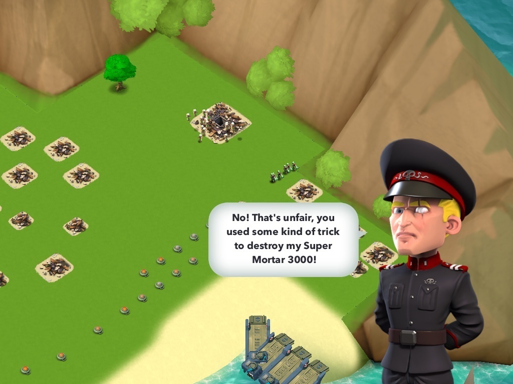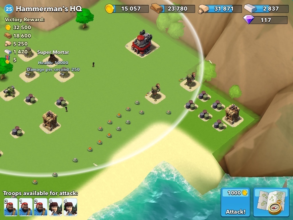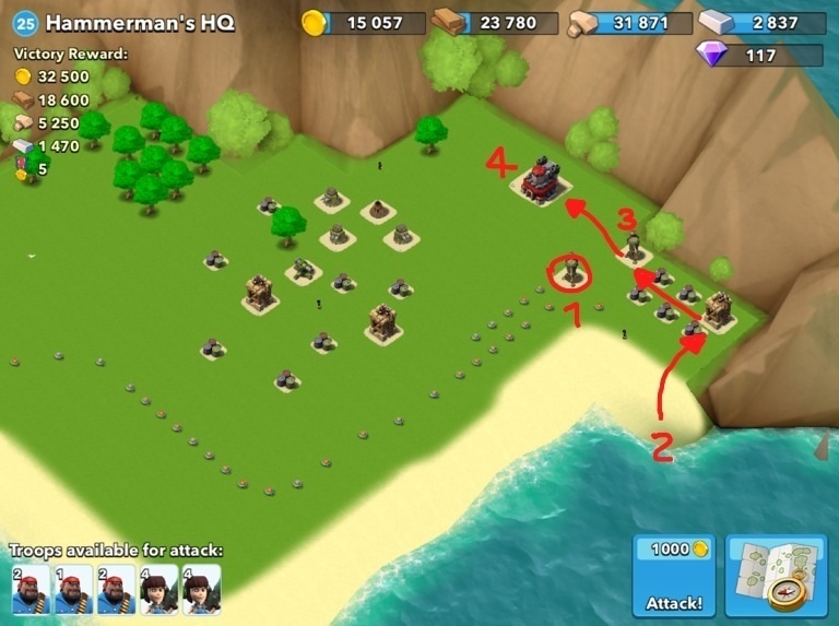 Zuerst wird der Flammenwerfer zerstört (roter Kreis). Anlanden mit 2 Heavies und 12 Bazookas, die den Sniper Lvl 11 vernichten. Auf dem Weg zum zweiten Flammenwerfer werden die Fässer mitgenommen. Nach Zerstörung des zweiten Flammenwerfers Wanderung Richtung Norden zum HQ.