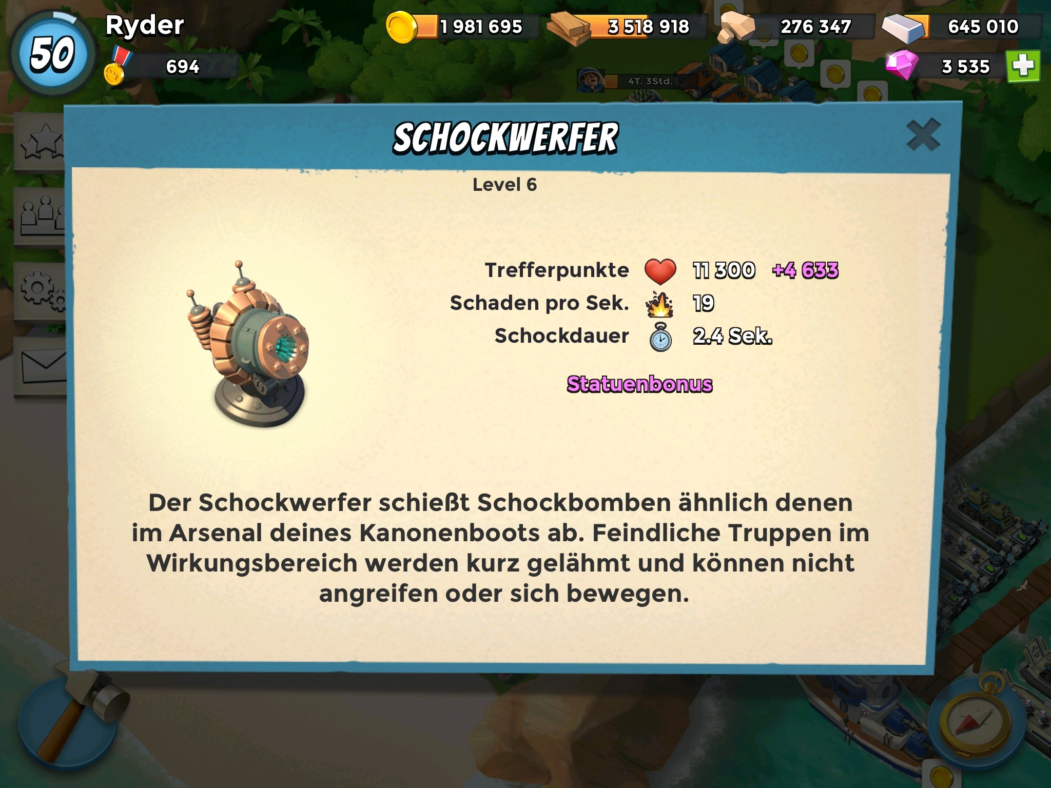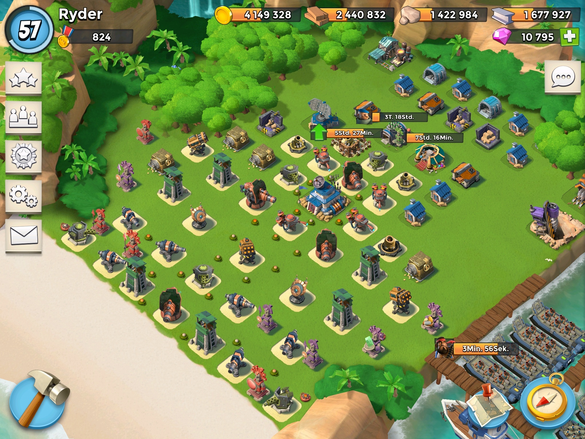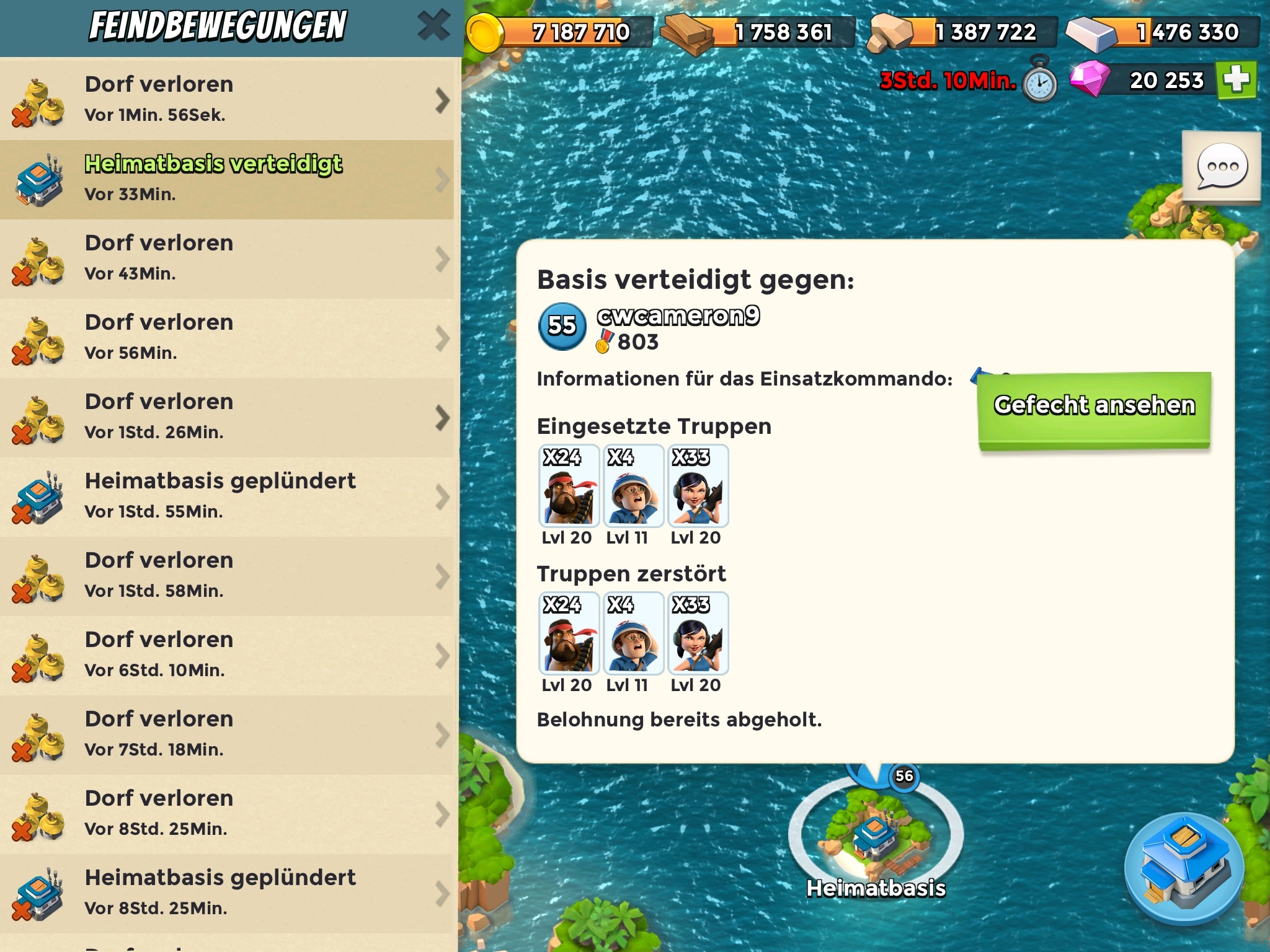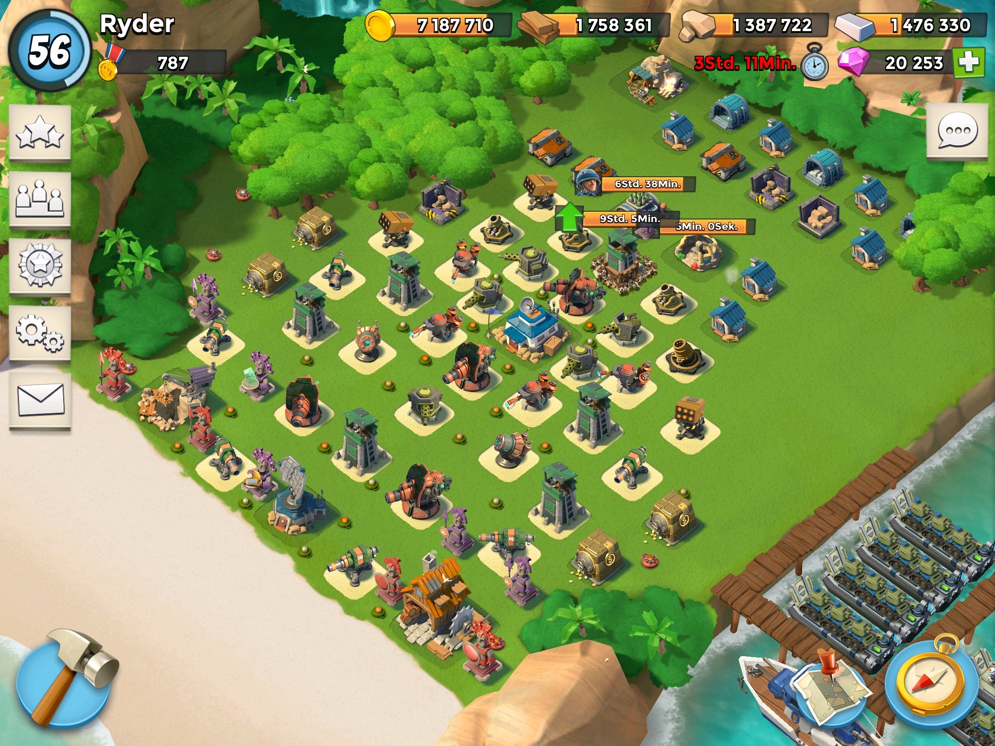 Gegen High-Level Warrior bin ich momentan noch machtlos - gegen Tanks und Hookas klappt die Defense prima, Ameisen hatte ich die letzten Wochen gar nicht zu Besuch. Und morgen sind beide Shocklauncher auf lv 6 mit ungepudert je ~ 16.000 HP - dann werden die schon äußerst lästig für Gäste, auch für Warriors