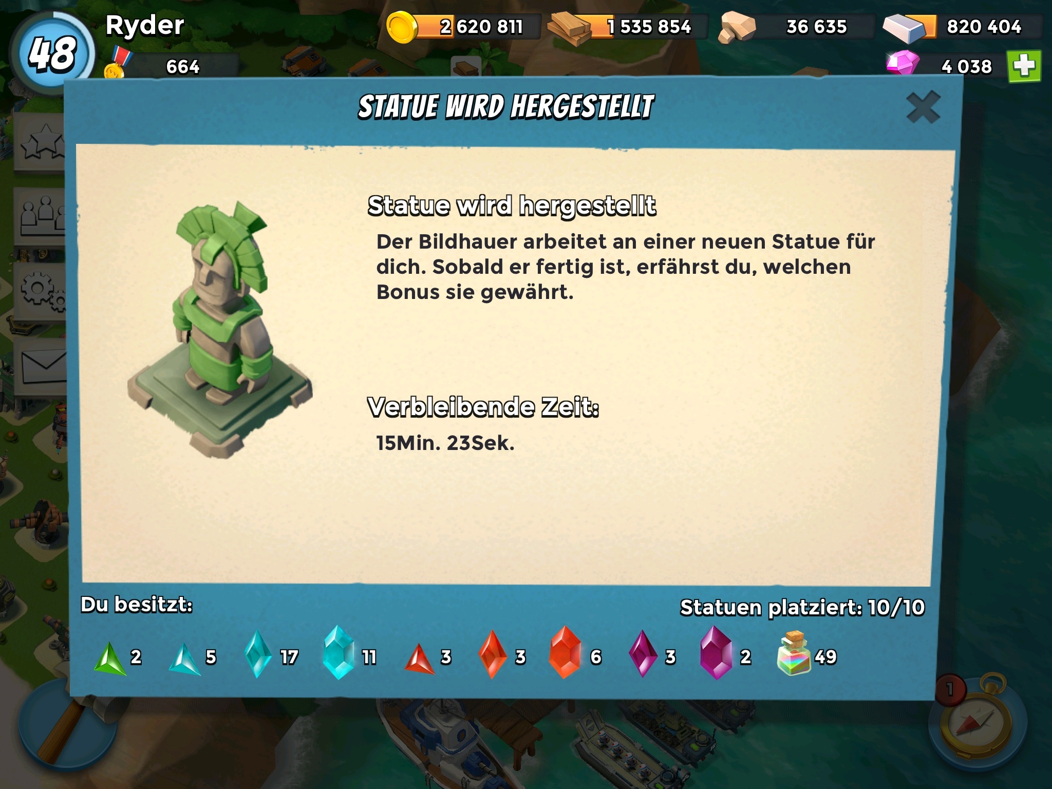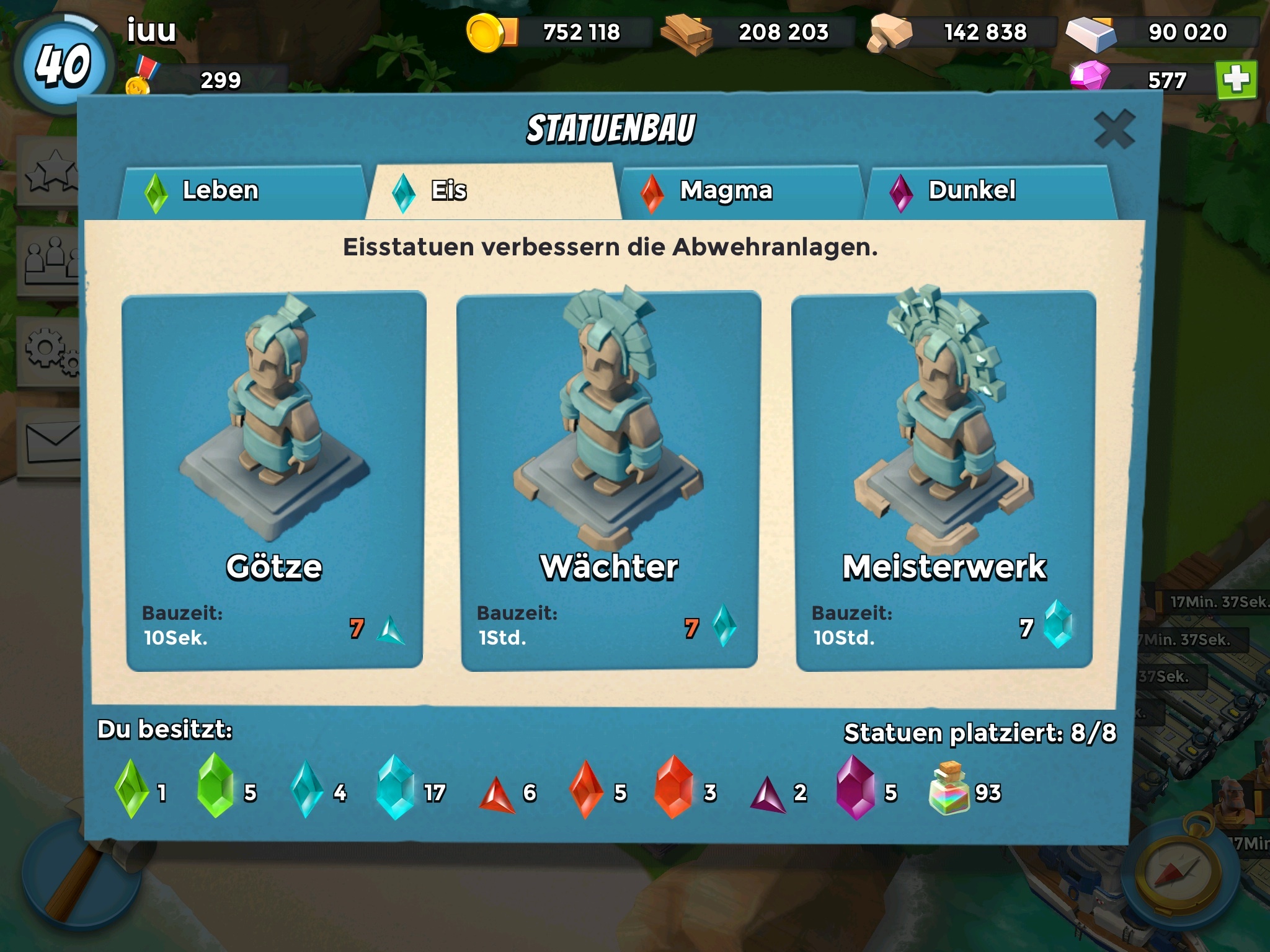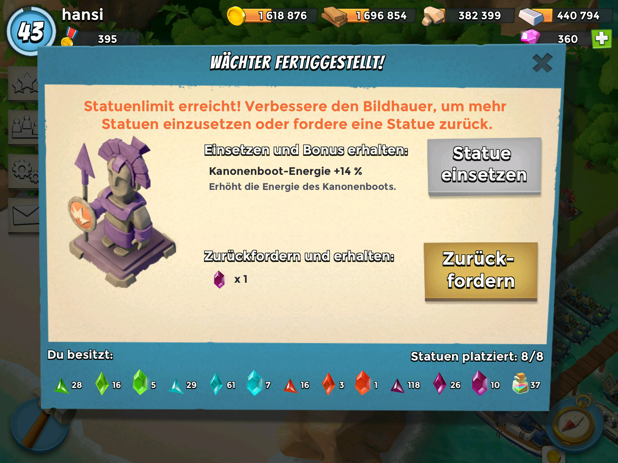 Blaue horte ich jetzt konsequent, bis ich so hoch gelevelt bin, das ich ein paar der anderen Statuen nicht mehr brauche - ich hab noch 2 dunkle und 2 rote Wächter, die nach und nach blauen Statuen weichen werden.