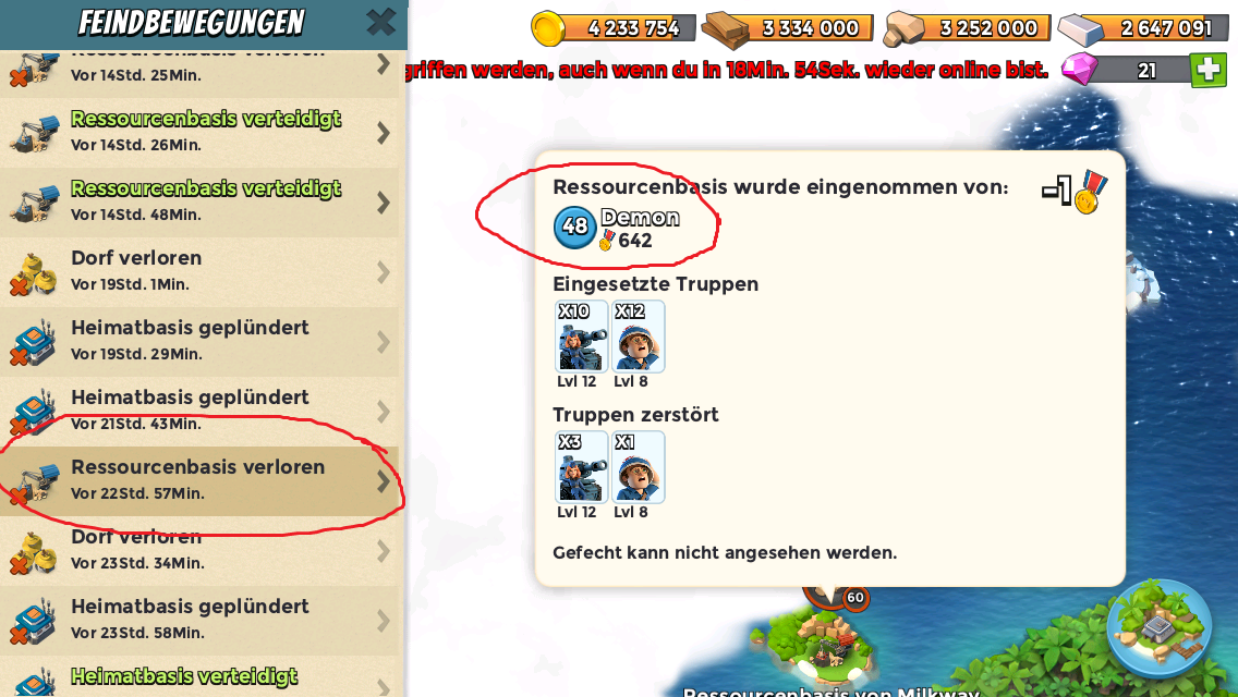 Milkway kämpfte mit Warriors und konnte die Basis nicht mehr einnehmen( er muss sie geskipt haben), danach kam Demon mit Tanks und Medics und konnte die Basis relativ leicht holen.Kurios dabei ist, dass ich bei Demon die Basis leicht zurückholen konnte, weil er keine guten Ice-Statuen und keine boosts hatte, aber Milkway hat bessere Ice-Statuen und 24/7 boosts auf diese...