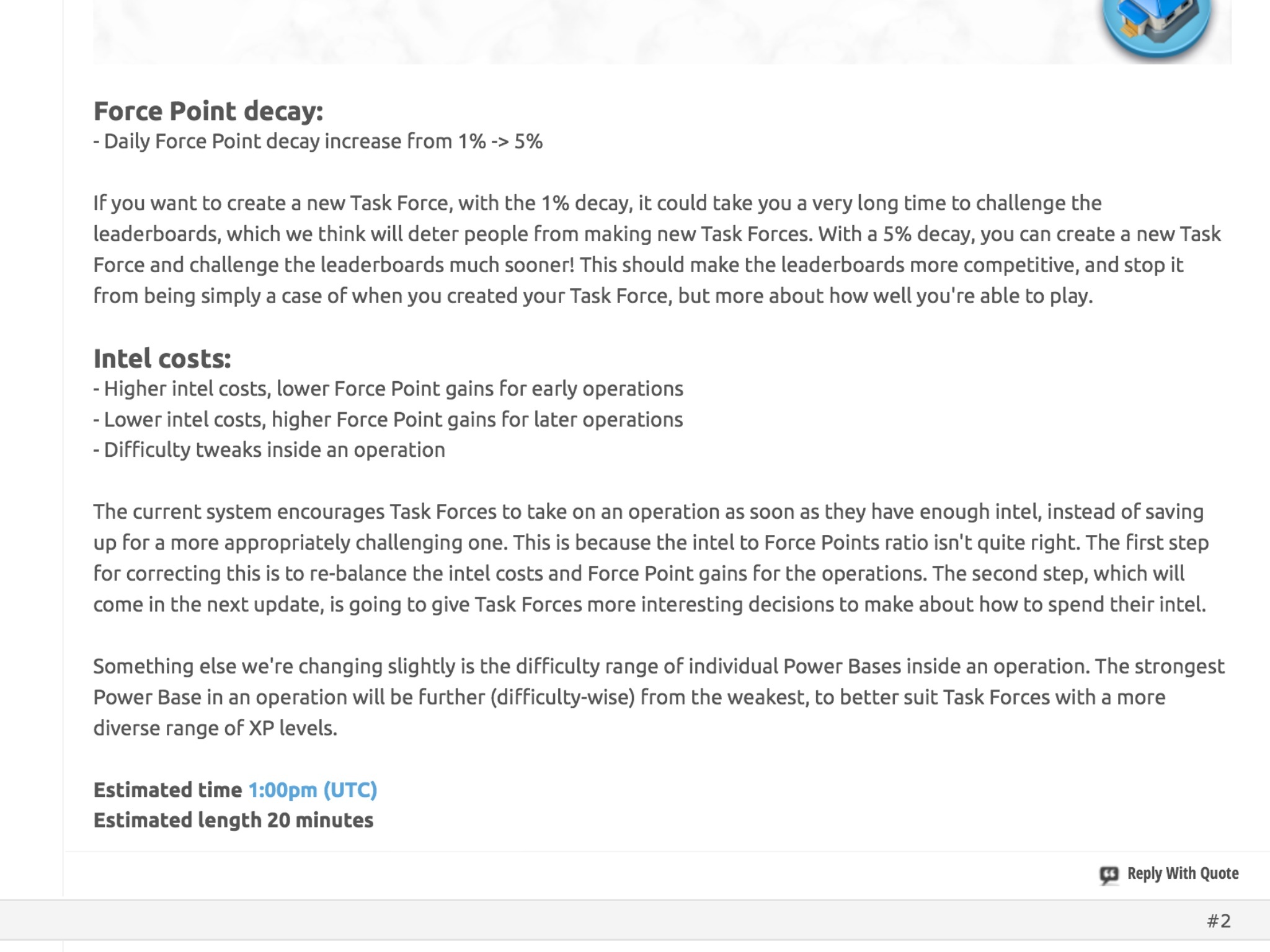 Ich warte erst mal bis morgen zum Doc ab, vielleicht habe ich bis dahin ja einige Siegpunkte verloren und es kommen leichtere Gegner und in Kombination mit dem Doc, der wohl nicht vereinfacht werden wird, gibt es dann noch 2 große Upgrades- die Schwergewichte müssen schwerer werden und meine Schatzkammer könnte auch mehr meiner Ressis schützen.Zum Thema TaskForce sage ich, dass mich das nun nicht so wirklich betrifft, denn ich bin kein Leader und muss nicht strategisch entscheiden, welche Base als nächstes dort angegriffen wird.