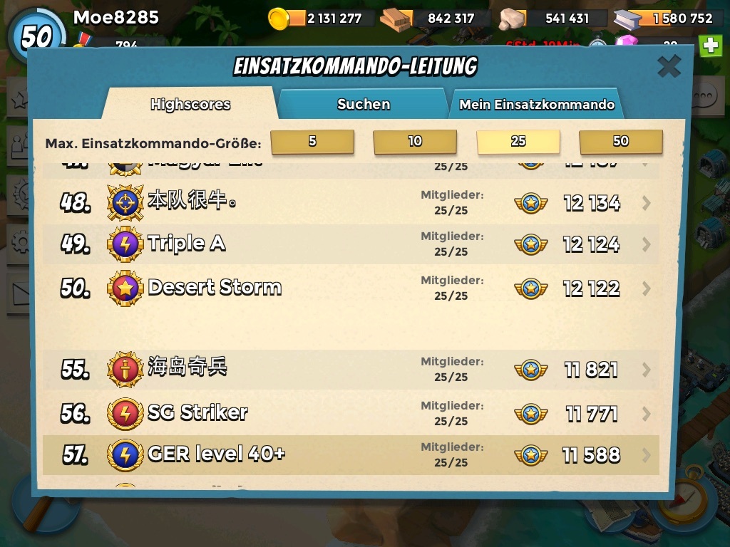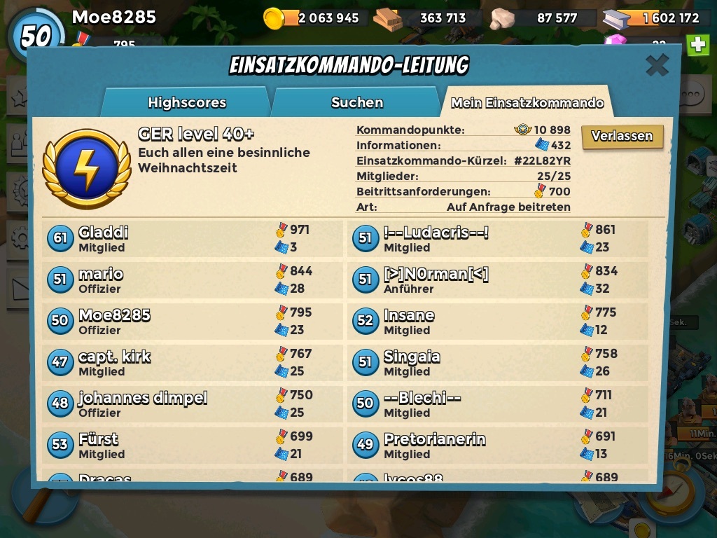 #25 Hallo Daniel. Ich bin der Anführer von GER lev 40+. Wie du schon richtig erkannt hast liegt die Anforderung bei 700 siegespunkten. Davon hast du ja nicht mal die Hälfte. Bei den Operationen die wir bewältigen wärst du keine große Hilfe und das würde dir dann auch kein Spaß machen.