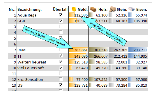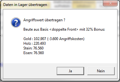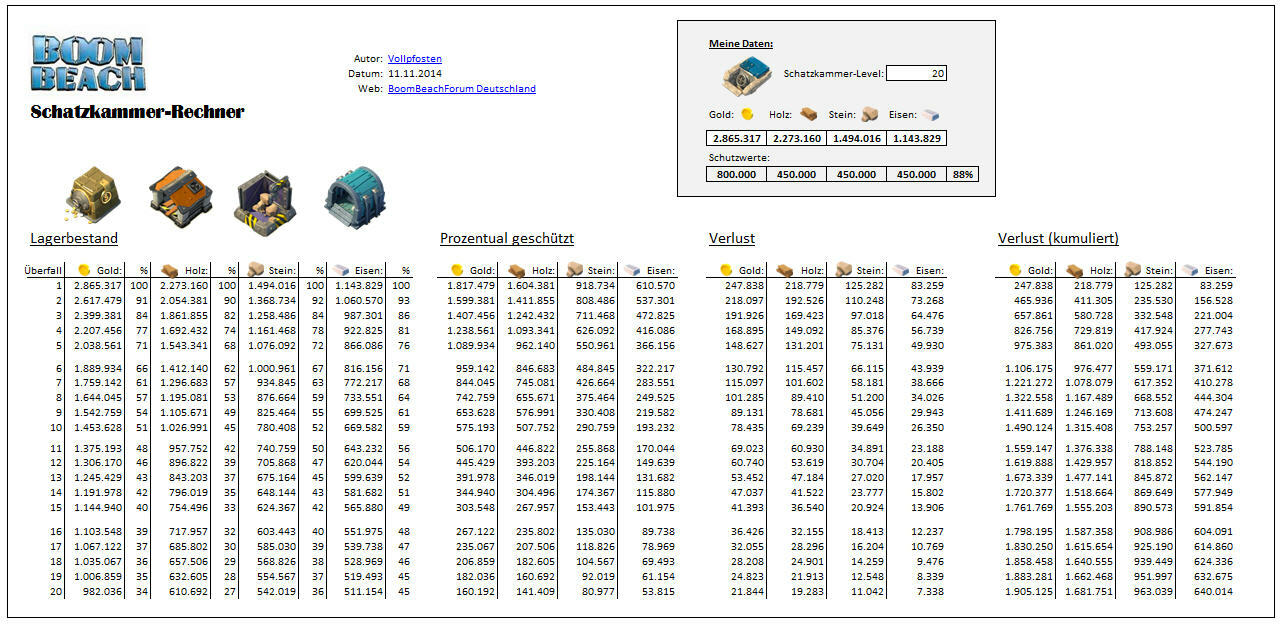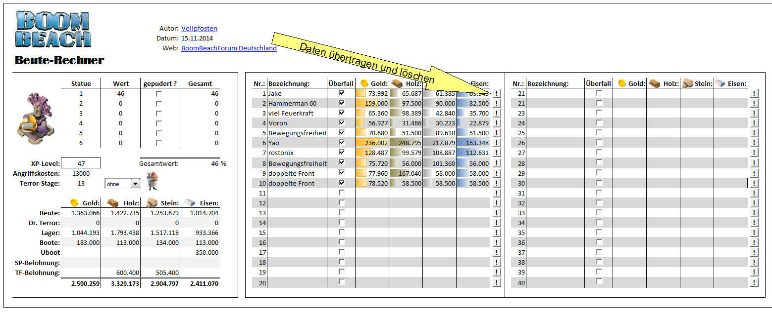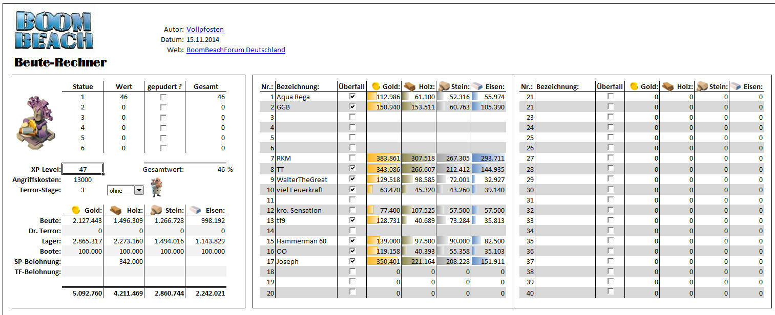 Und dann muss man das ja auch in einen sinnvollen Kontext bringen und das ist eher nicht jedermanns Sache. Also habe ich das alles nun verwurstet und es in eine leicht zu benutzende Excel-Tabelle gestopft, die mir alle benötigten Informationen kredenzt, um einen Grossangriff mit dem gwünschten Ergebnis durchziehen zu können. Gestern getestet, weil ich mal wieder ein Landungsboot 20 auf dem Plan hatte, was ja bekanntlich 3.6 Millionen von jeder Ressource will und prima.