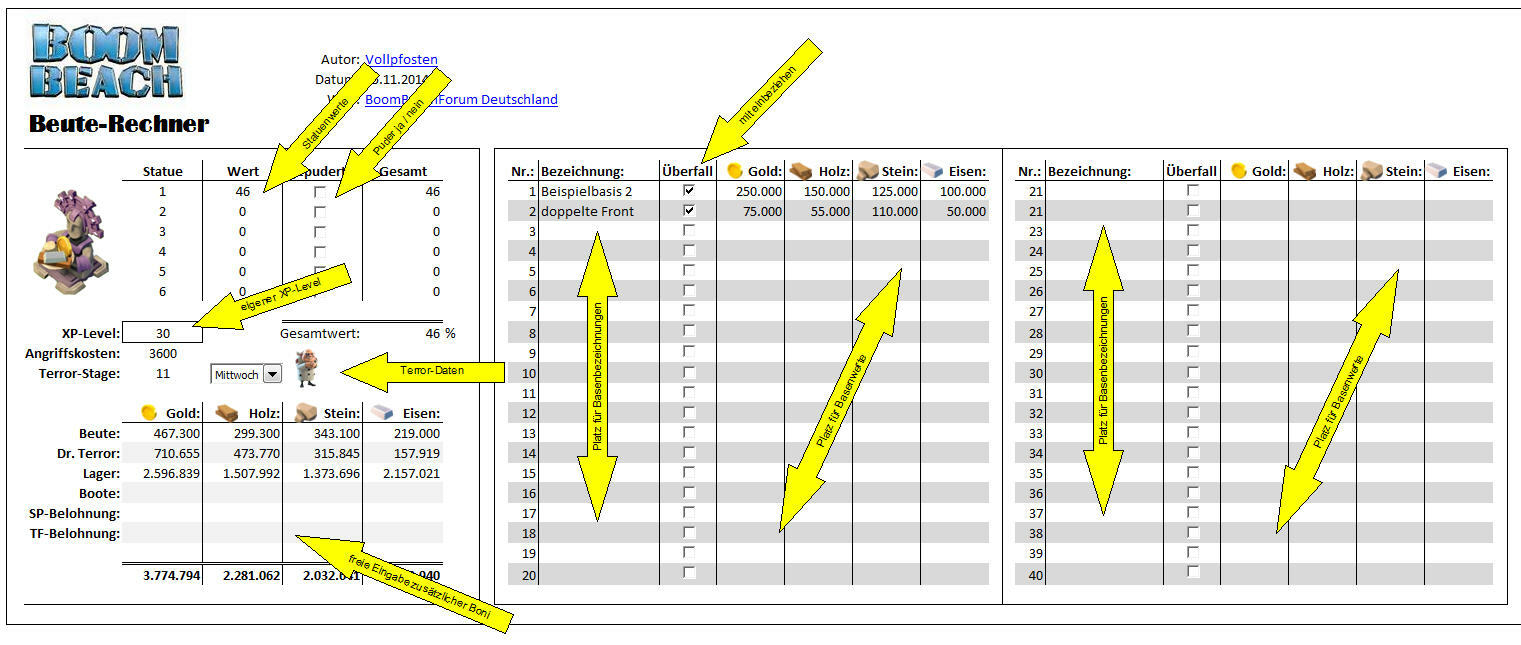 Und dann muss man das ja auch in einen sinnvollen Kontext bringen und das ist eher nicht jedermanns Sache. Also habe ich das alles nun verwurstet und es in eine leicht zu benutzende Excel-Tabelle gestopft, die mir alle benötigten Informationen kredenzt, um einen Grossangriff mit dem gwünschten Ergebnis durchziehen zu können. Gestern getestet, weil ich mal wieder ein Landungsboot 20 auf dem Plan hatte, was ja bekanntlich 3.6 Millionen von jeder Ressource will und prima.