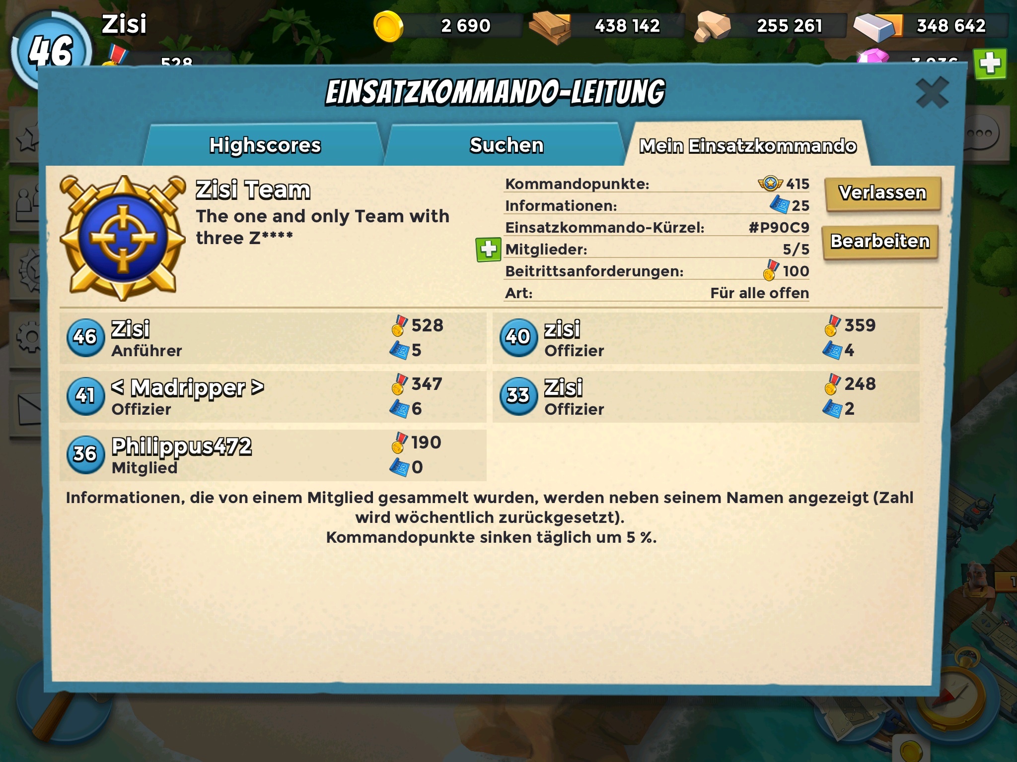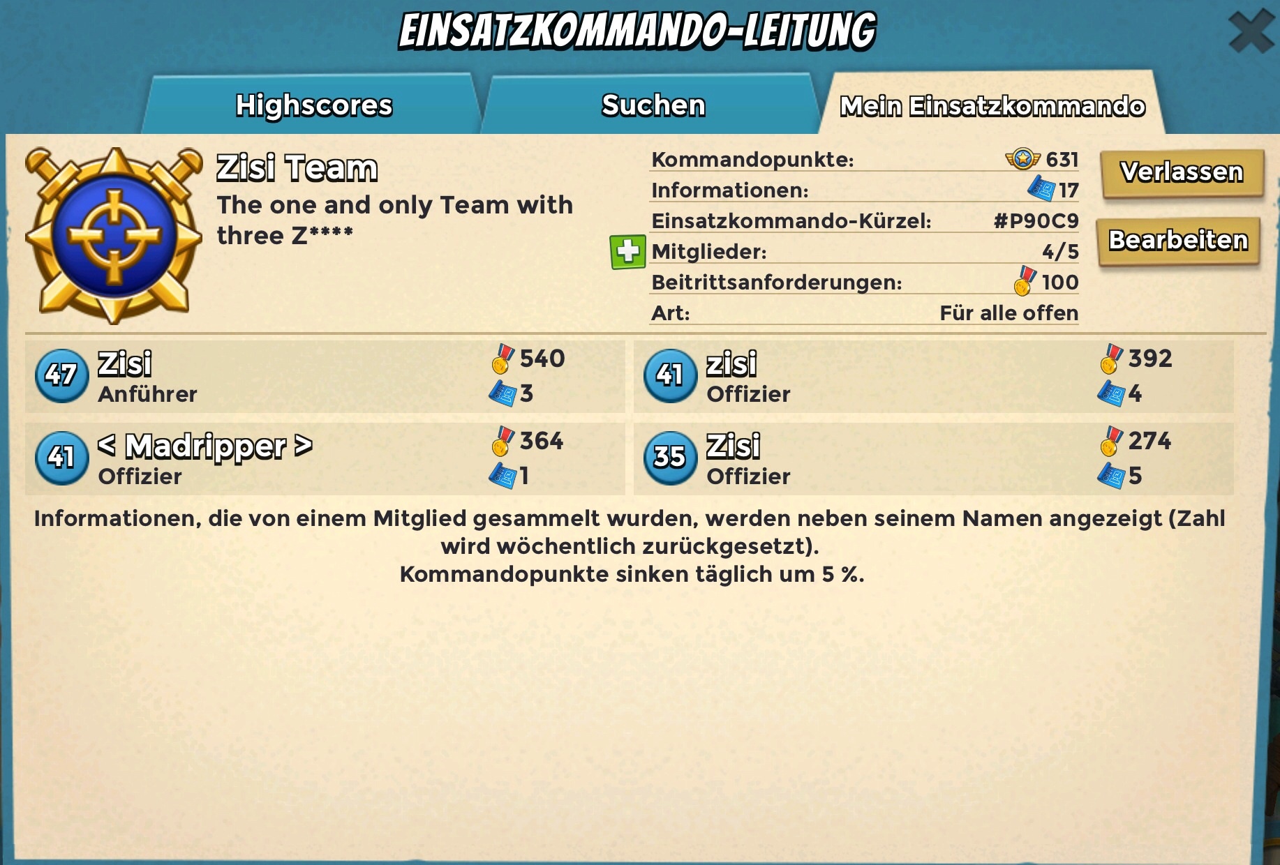 wir das Zisi-Team (3 Cousins) haben eine 5er Task Force. Momentan sind wir 4 gute Spieler, die regelmäßig Intel sammeln und sich aktiv an den OPs beteiligen.