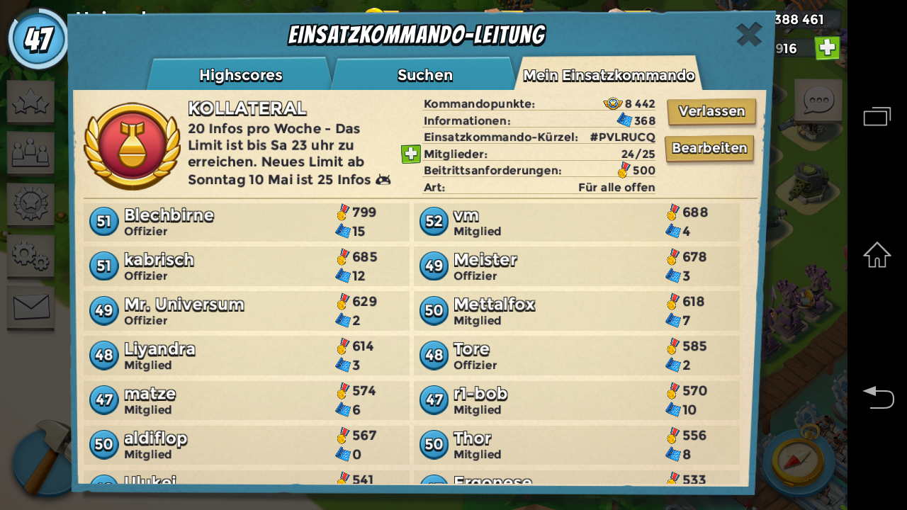 Angriffe: An schweren Operationen (203 Infos aufwärts) beteiligen sich meistens 24 von 25 Mitgliedern. Manchmal sogar 100% - Ein super Wert! ![]()