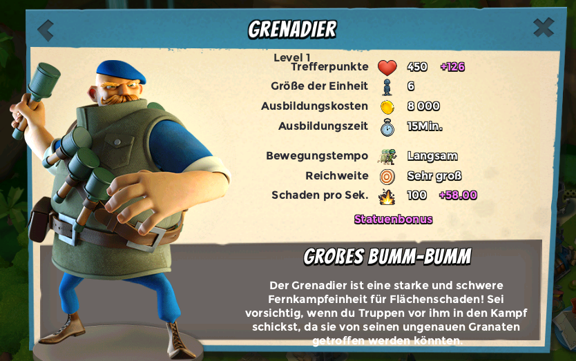 • The Grenadier! A powerful ranged unit that deals area damage, rather inaccurately (available at HQ 16)