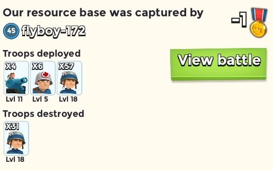 Wieder so ein Fall: Resource Base verloren, 10 Tanks Lvl 9 (Angreifer Lvl 39). Wenn ich mir überlege, dass die zig Millionen Kosten und ca. 700 Stunden zum Aufleveln benötigen (exkl. der Armory, die auch auf 15 muss und zighunderttausende an Ressourcen benötigt) könnte ich echt abko... Unsereins spielt das Spiel, aber es gibt leider genug Idioten (wie auch bei CoC), die nur auf zweifelhaften Erfolg aus sind.