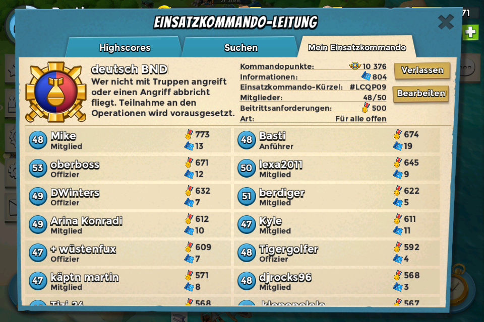 Wir starten unsere Operationen täglich um 19:30 Uhr. Momentan sind wir dabei, täglich 690 Kommandopunkte zu erspielen und haben dadurch bedingt auch sehr hohe Belohnungen.