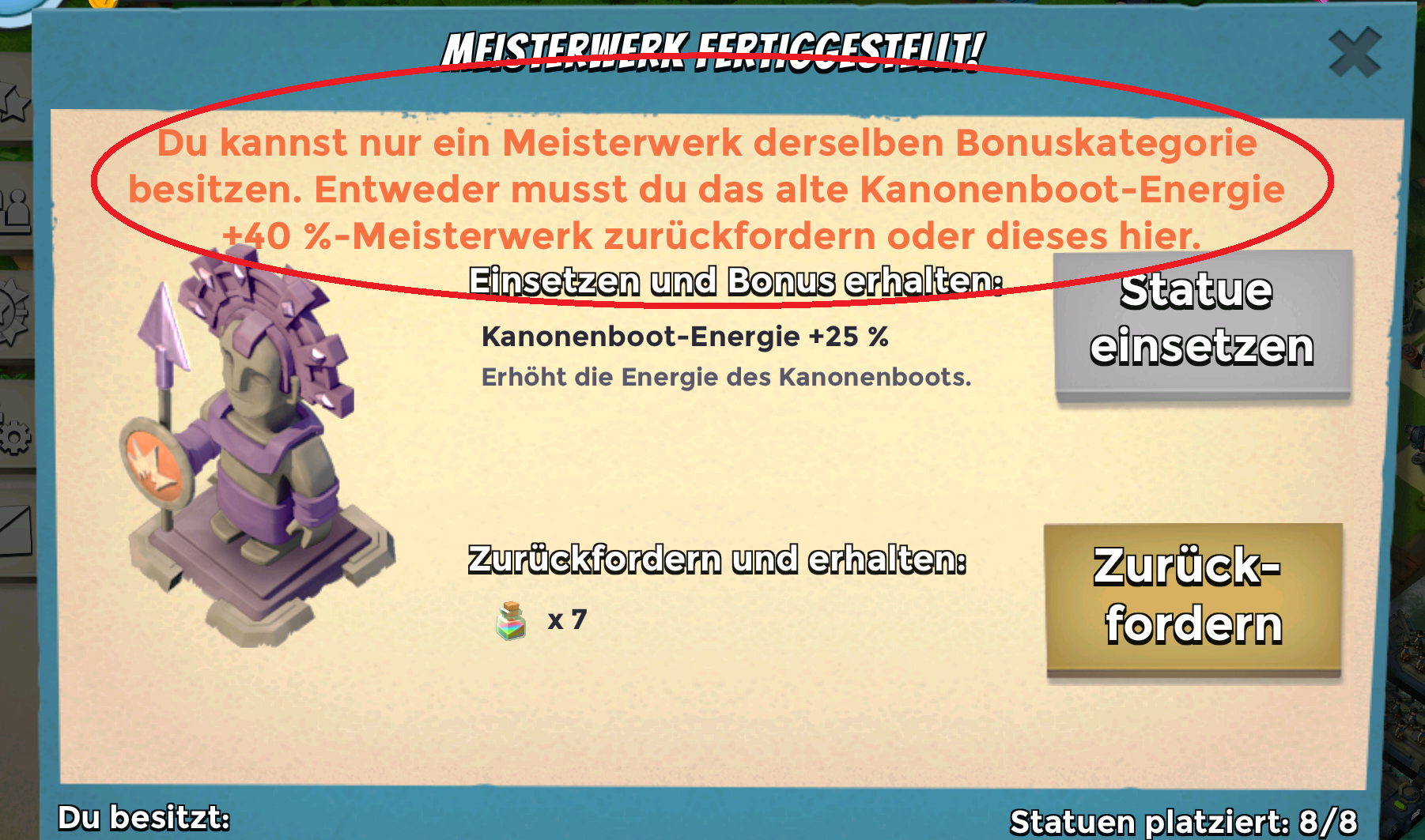Anbei ein Bild. Ich habe wieder ein Meisterwerk, Kanonenboot-Energie 25%. Möchte dies gerne einsetzen, geht aber nicht. Wenn ich mir aber andere Basen anschauen, haben Spieler mehrere Meisterwerke derselben Kategorie. Wieso geht das in diesem Fall nicht?