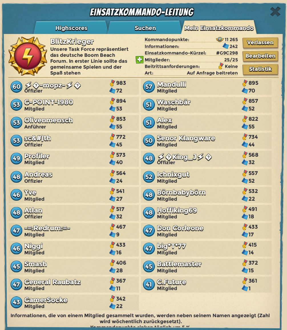 Die BlitzKrieger sind eine der ersten TFs dieses Forums. Wenn Du häufiger im Forum ließt, wirst Du die meisten von uns kennen. Bei uns haben sich 25 Spieler zusammen gefunden, die am Anfang noch sehr klein waren, oder die einfach ohne großen Druck spielen wollten. Heute sind unsere Spieler zwischen Level 43-60 und man wird den Eindruck nicht los, irgendwann werden die Letzten die Ersten sein. ![]()