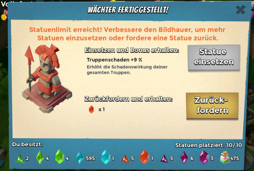 Ich krieg langsam aber sicher die Krise. Seit ungefähr einem Monat habe ich keine brauchbare mehr erhalten, und es ist ja nicht so, dass ich bereits überall die super-duper Statuen hätte. Ich würde schon lange gerne mal einen blauen Wächter für Gebäude TP aufstellen, aber ich erhalte immer nur 9% Müll.