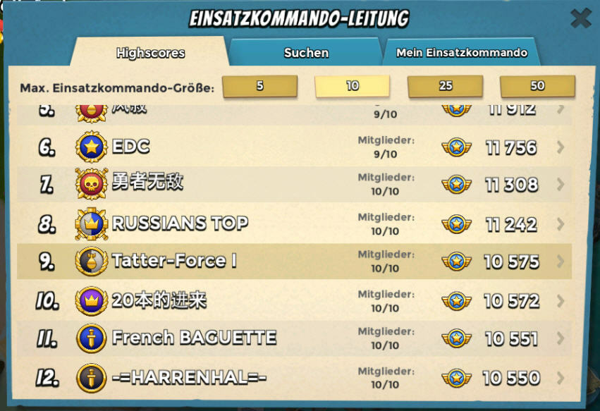 Da wir unsere punkte der zehner tf mitgenommen haben befinden wir uns zur zeit auf platz 220 aber wir hoffen bald große schritte nach vorn machen zu können denn die derzeitige kampfkraft entspricht ja nur zehn leuten und mit 15 mehr sollte schon fast dead end möglich sein.