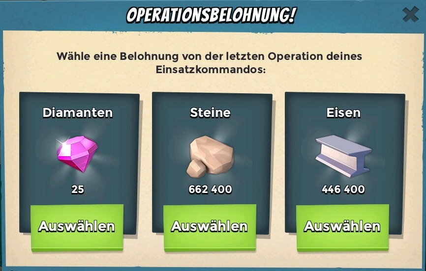 Hier mal beispielhaft eine meiner OP-Belohnungen. Bis zum Update neulich waren es sogar 29 Dias für ne gestürmte Festung. Das ist die 880er OP und derzeit unsere Standard-OP mit Bases zwischen 110-130. So ein RW oder SW hat dann schonmal 80k TP.
