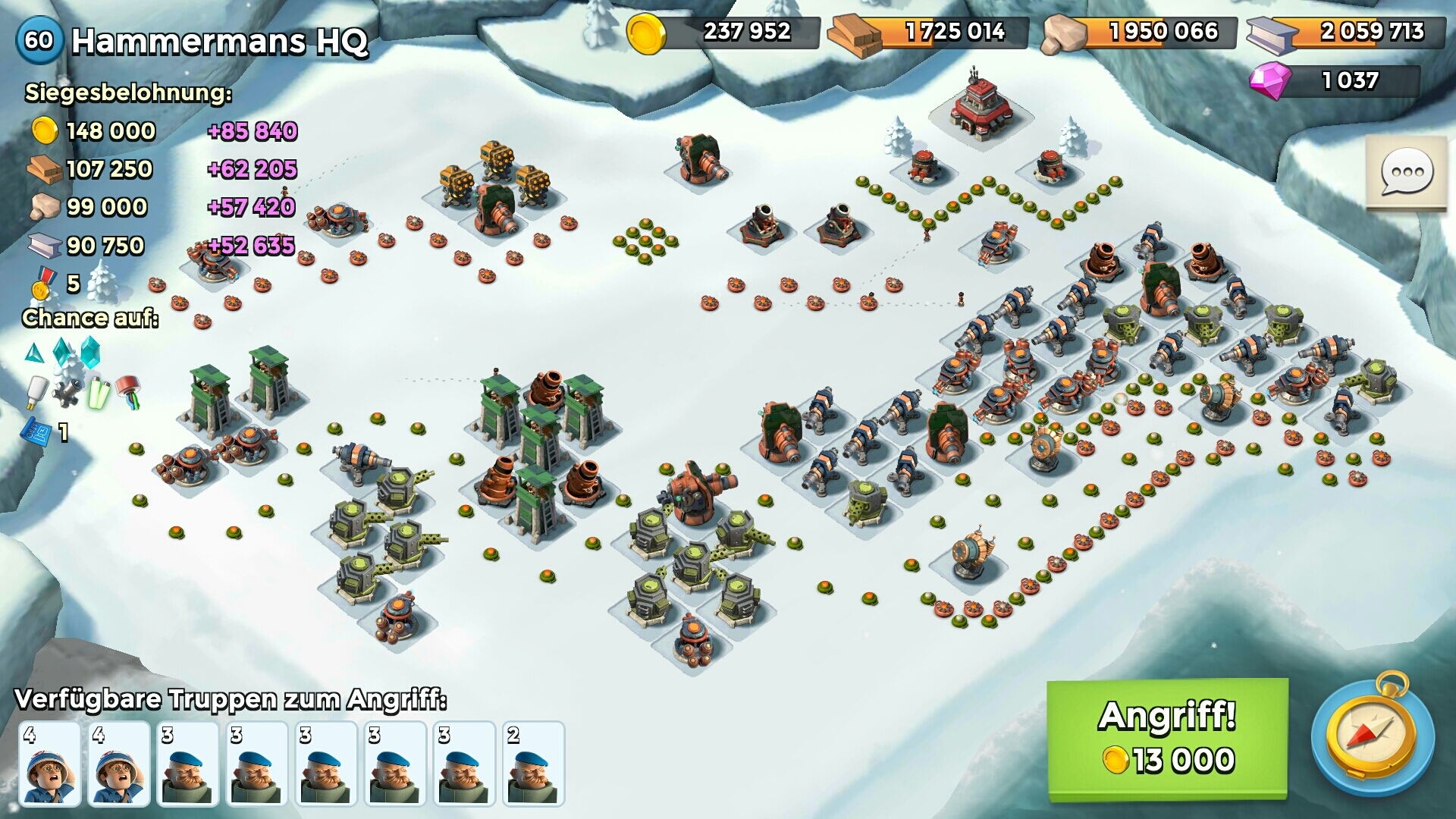 Ich bin jetzt beim letzten Hammermann und stehe mit meinen Grenadiers lv6 erst mal an während die vorigen kein Problem waren. Jemand einen Tipp wie ich das am besten machen könnte? Links fällt denke ich aus alleine schon wegen denn 3 Schocker. Über rechts habe ich es probiert und komme zumindest in die nähe vom HQ aber die beiden Mega Kanonen und die 2 starken MG machen mich immer wieder fertig. Bis jetzt habe ich mit denn Raketen immer die 1 Boom und die 3 Raketenwerfer zerstört und dann nochmal 2 Raketen auf die beiden Mega Kanonen aber die nahmen kaum schaden.