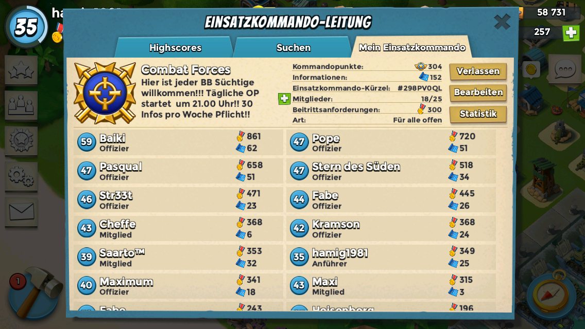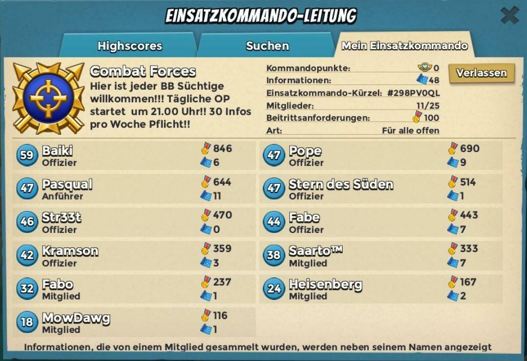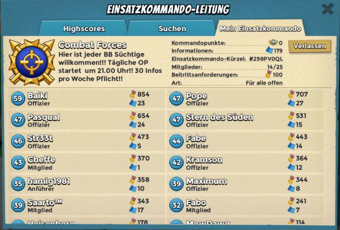 Wir suchen noch Spieler für unser EK! Wir stellen uns kurz mal vor: Alle von uns waren Offiziere eines guten EK und haben alle immer über 50 Infos die Woche gesammelt damit wir 15er OP starten und auch erfolgreich beenden konnten. Aus mehreren Gründen haben wir beschlossen unser eigenes EK zu gründen.Noch sind wir am Anfang und wer auch so süchtig ist kann gerne mal vorbeikommen! Alle sind herzlich Willkommen! Wir sind ne ganz tolle Truppe, nur freundliche Leute und außer mir (hamig1981) alle über Level 40! Wir besprechen die OP's die täglich um 21.00 Uhr starten und schreiben auch immer Infos damit sich jeder auskennt. Im Durchschnitt sind wir über 30 Jahre alt, also keine Kinder dass soll aber nicht heißen dass wir nur gleichaltrige begrüßen sondern dient nur als Information! Falls ihr Fragen habt scheut euch nicht sie zu stellen!