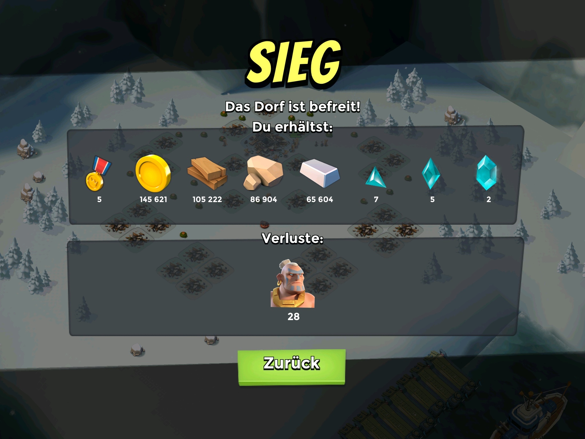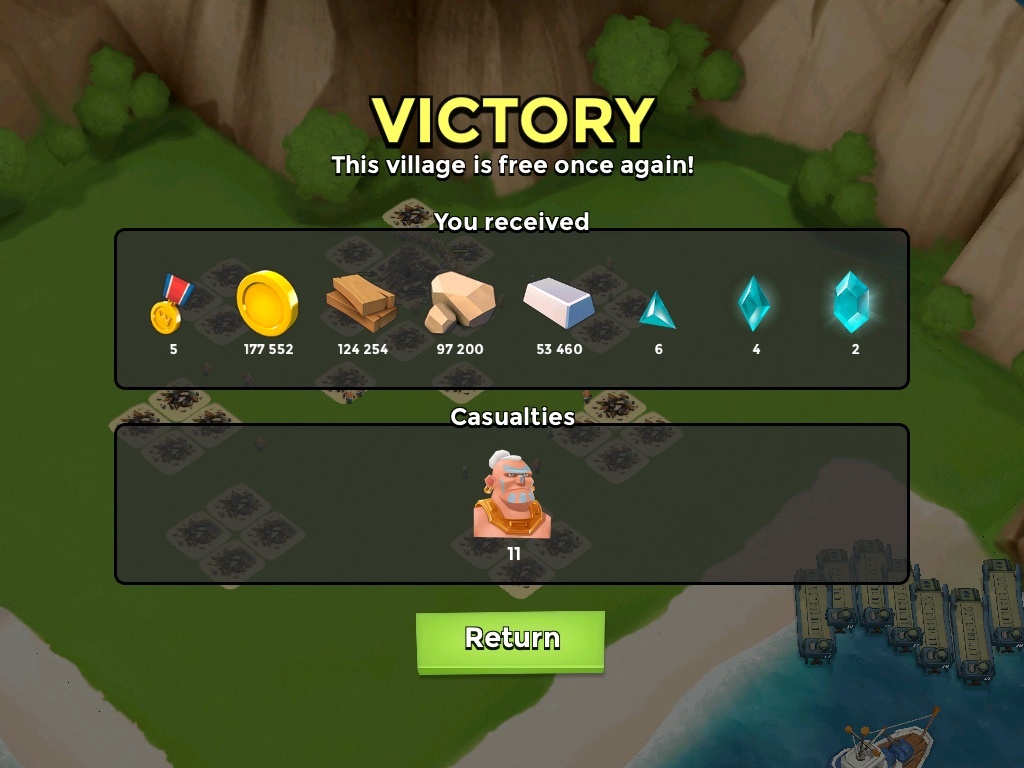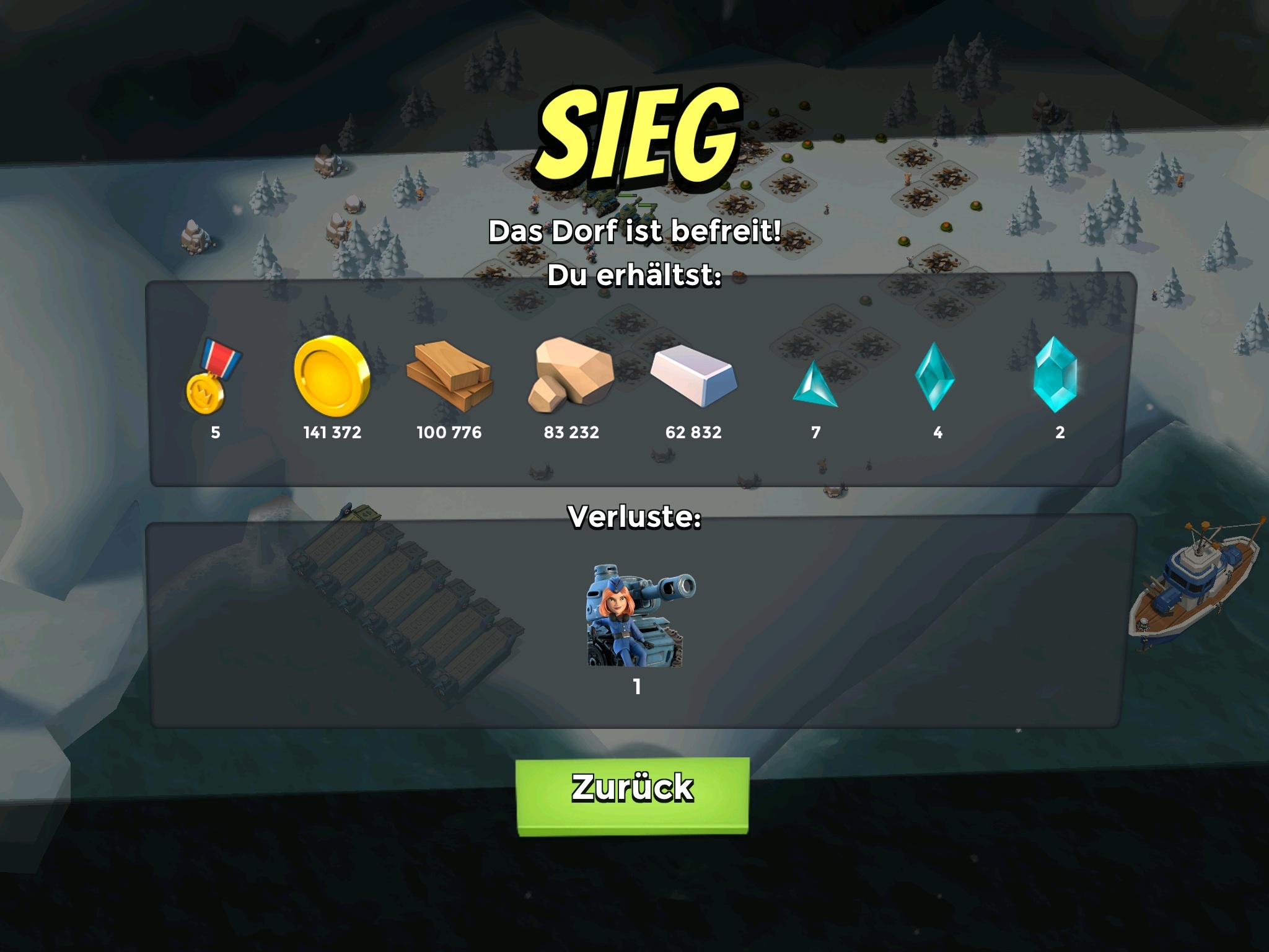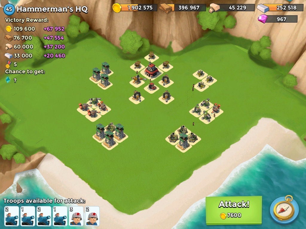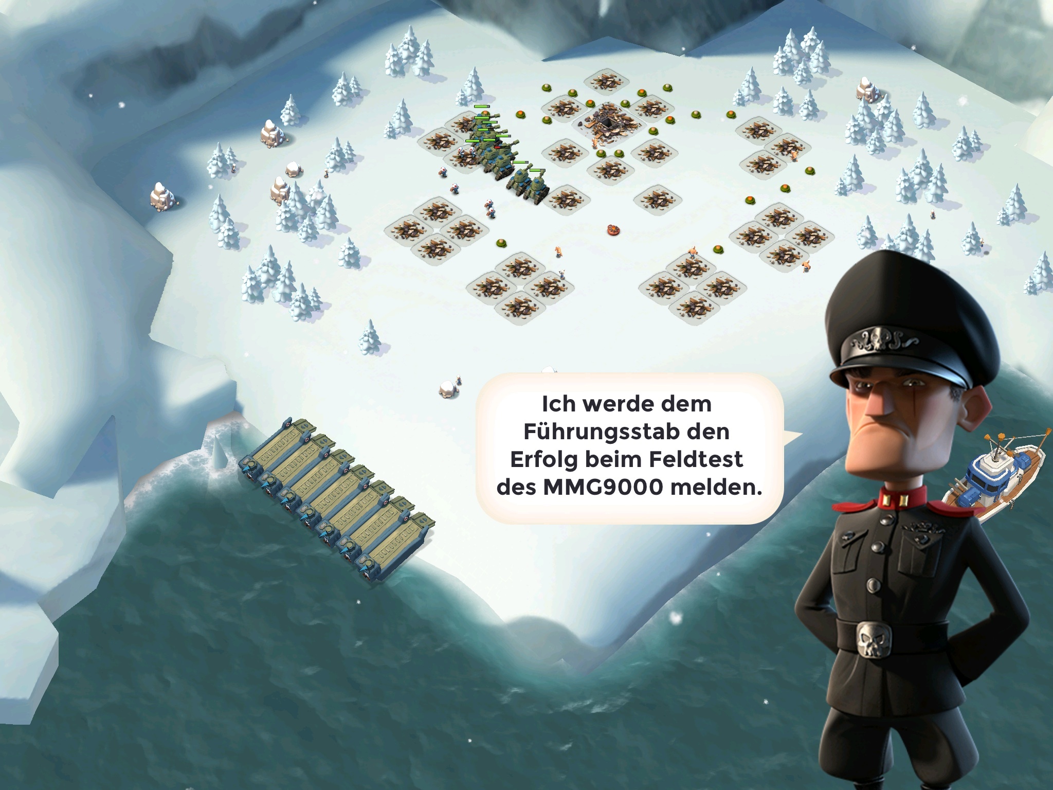 Meine Truppen waren 10 Tanks lv7, 6 Sanis lv2 , Gb-Energie 77 (gepudert) - Artillerie ist glaub ich lv14, Bombardement lv6.