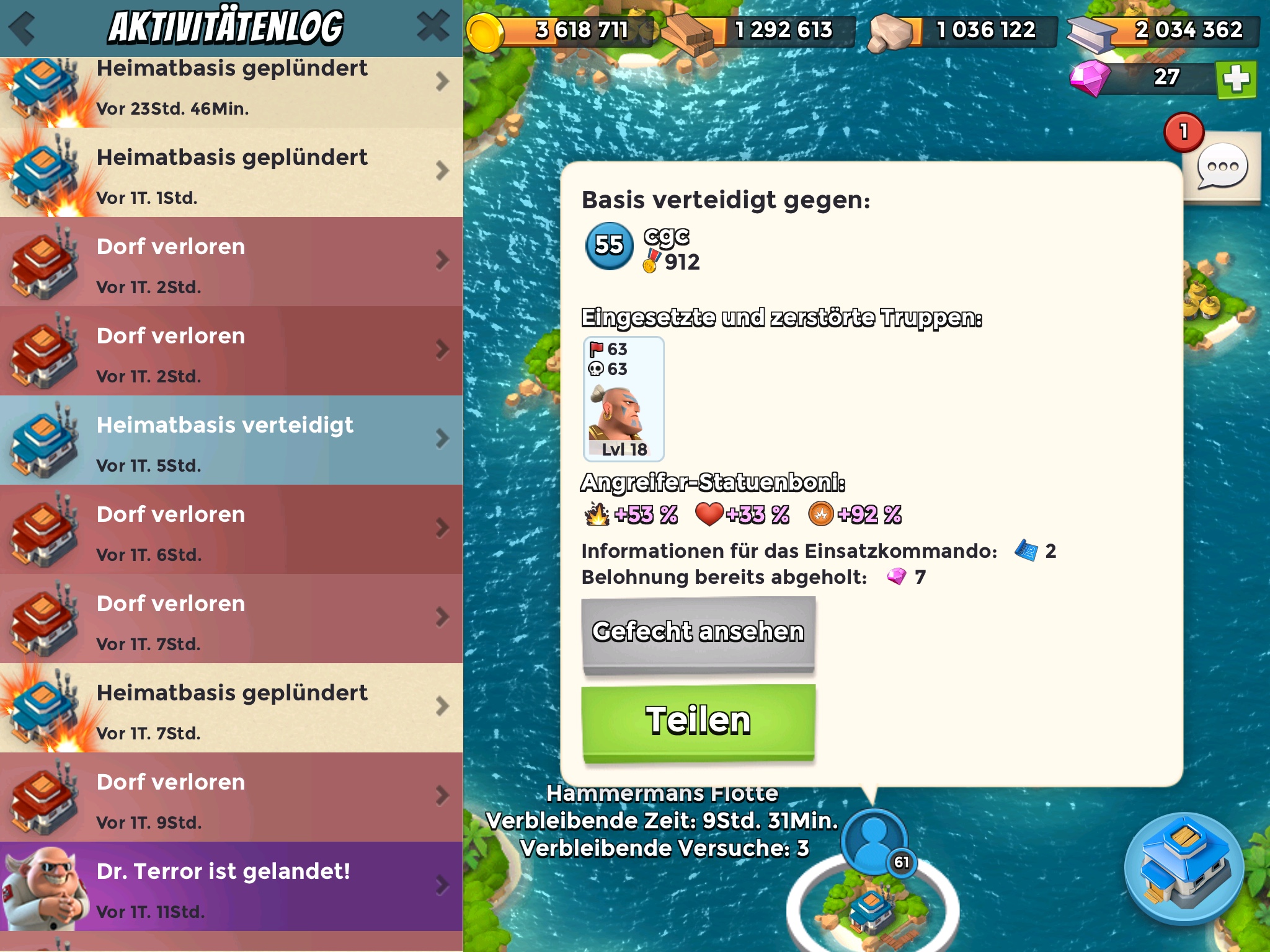 Aber auch sehr gute Erfolge -für ohne blau- bei Tanks. Alle paar Tage sogar eine Verteidigung bei diesen und sonst gibt es meistens (wenn sie ungepudert angreifen) mindestens ein Intel.