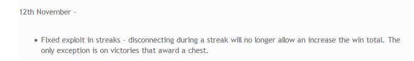 So wie ich es verstehe war das wohl ein Exploit der jetzt gefixt ist, ohne Dias (oder Warten im Reload Bildschirm) werden die Siege nicht mehr erhöht: