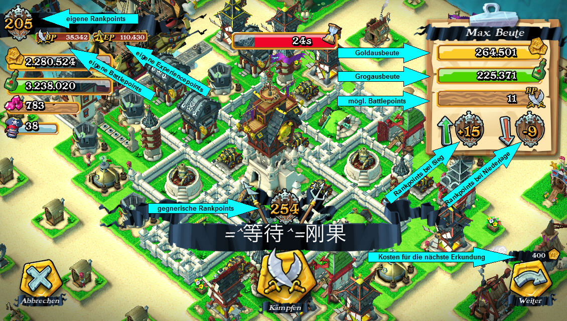 Hierzu sollte man wissen, daß die Angaben in der Kiste oben rechts Maximalwerte sind und nur dann zum Tragen kommen, wenn man eine 3-Sterne-Plünderung geschafft hat.