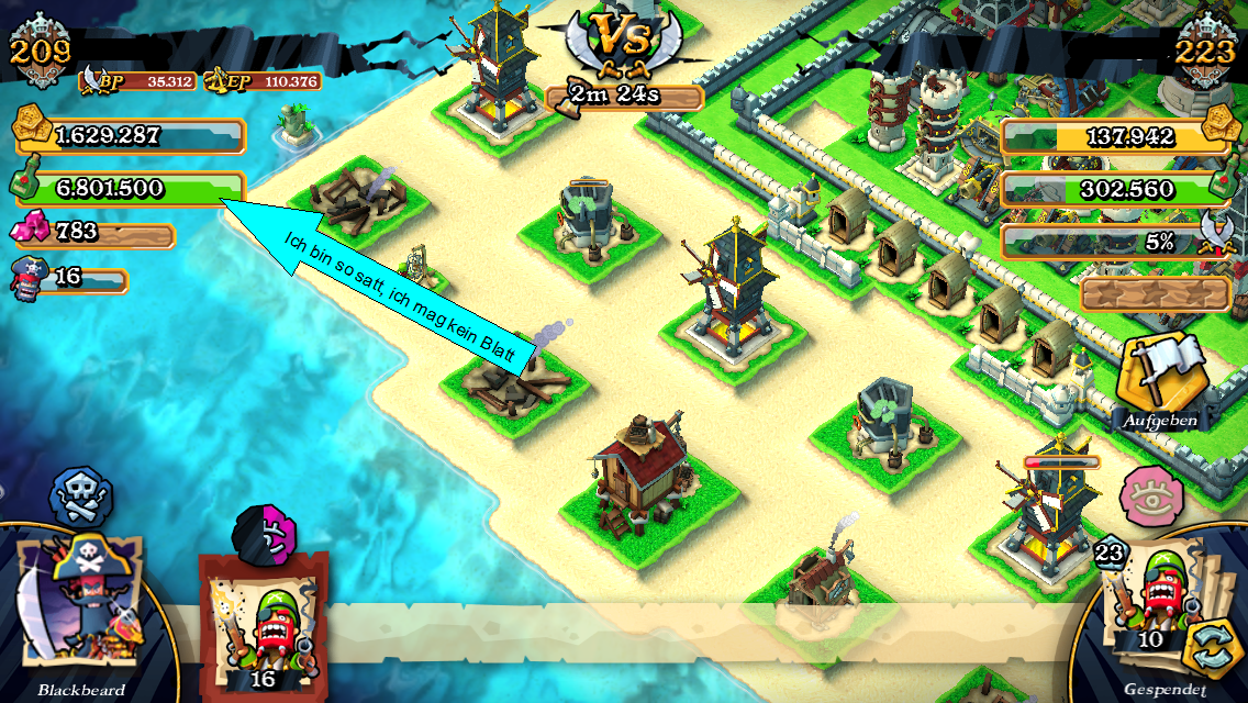 Battlepoints, BP - Sollen "Kampfpunkte" sein, also die erhält man nach dem erfolgreichen Beseitigen eines Gegners. Aber auch als Belohnung in Fischen und Zeugs auf der Karte, durch Erledigen von kleinen Aufgaben der Inselbewohner und auch in den Schatztruhen, die nach Ansehen eines Videos eine Belohung offenbaren. Baim Kauf grosser Diamantenpakete sind die ebenfalls dabei.