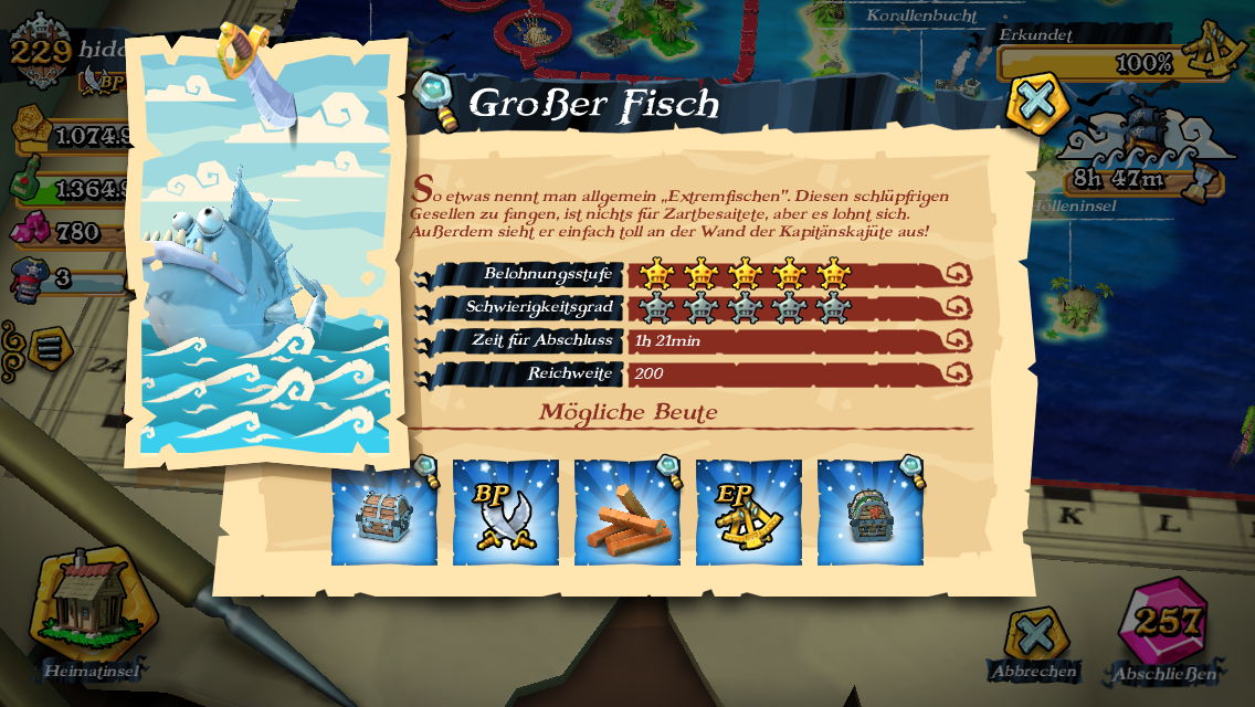 Meine Mannschaft für die Reisen ist meist die gleiche wie die für die Standardplünderungen; das macht das Recycling einfacher, wenn welche übrig bleiben.Bei meiner voll aufgedeckten Karte gibt es nun die 5-Stern-Objekte und ich dachte, mach' mal einfach einen zum Schluss platt. Auf dem Weg haben die Piraten schon das eine oder andere Kleinzeug erledigt und am Ende sollte es dann das Fischli sein. Tja, Pech, wenn man auf die Jagd nach den 5-Sternern geht, dann sollte man tunlichst DIREKT dort hinreisen, ohne auf dem Weg auch noch was mitzunehmen. Denn das ging kräftig in die Hose.