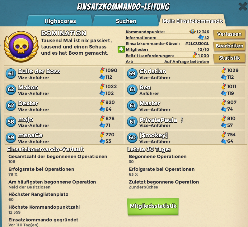 Wir sind ein gut eingespieltes deutschsprachiges Team und streben die TOP 50 an. Zur Zeit sind wir auf Platz 82 mit über 12'000 Kommandopunkten und spielen Zunderbüchse/Foxtrot.