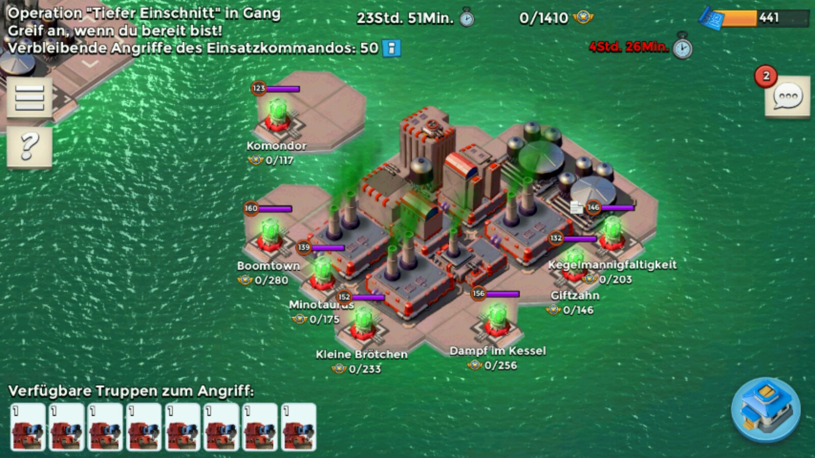 #45 Alles anzeigenHaben für die 156 Variante bei Tiefer Einschnitt satte 15 Angriffe gebraucht zum Glück waren alle anderen Ziele nach 28 down somit kein Problem. Wenn jedoch mehrere solche Dinger auf einmal kommen könnte es auch mal eng werden aber generell hat man sich mittlerweile gut darauf eingestellt
