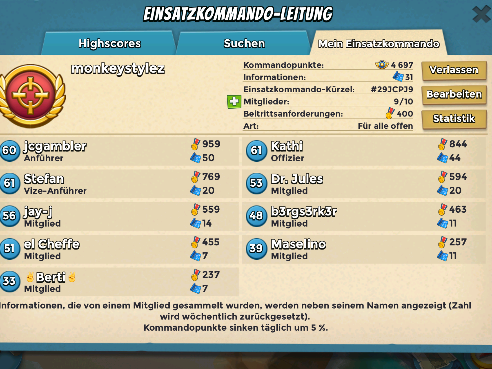 Unsere 10er tf "monkeystylez" sucht noch ein Mitglied. Wir sind zwischen lvl 33 und 62 wobei die Mehrheit über 50 liegt. Falls DU dich angesprochen fühlst über 450 Punkte bieten kannst, aktiv am Infos sammeln bist, schließ dich uns an.