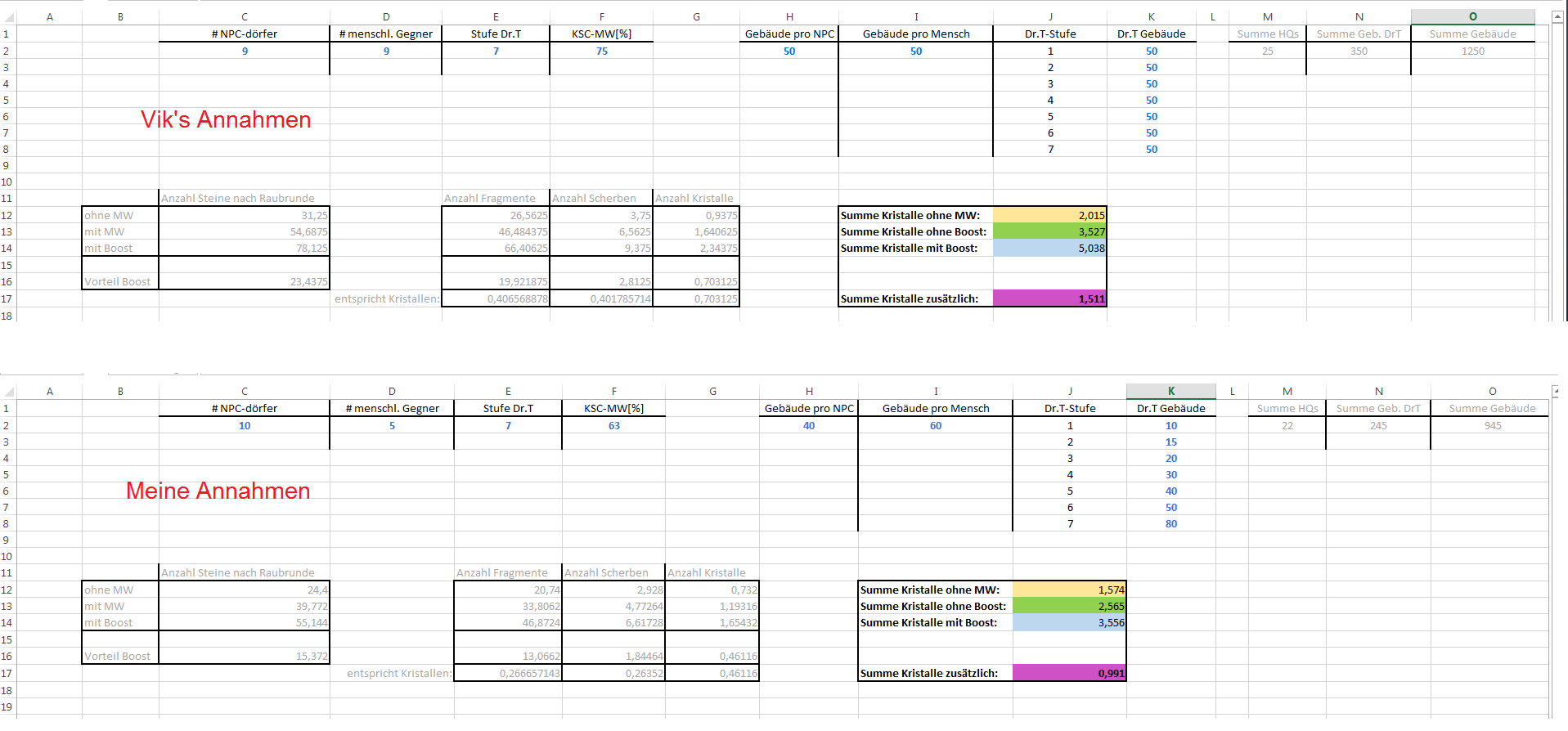 Man sieht den Verlauf der Berechnungen für 2 Fälle, einmal Viks Annahmen, und dann meine verfeinerten Annahmen bezüglich Anzahl der Gebäude und meine persönliches KSC-Prozentzahl von 63%. Alle variablen Größen habe ich in blauer Schrift unterlegt, grau sind Zwischenergebnisse. Unten rechts ist jeweils das Ergebnis zu sehen, also Anzahl der zu erwartenden Kristalle ohne KSC, mit KSC und mit geboostetem KSC.