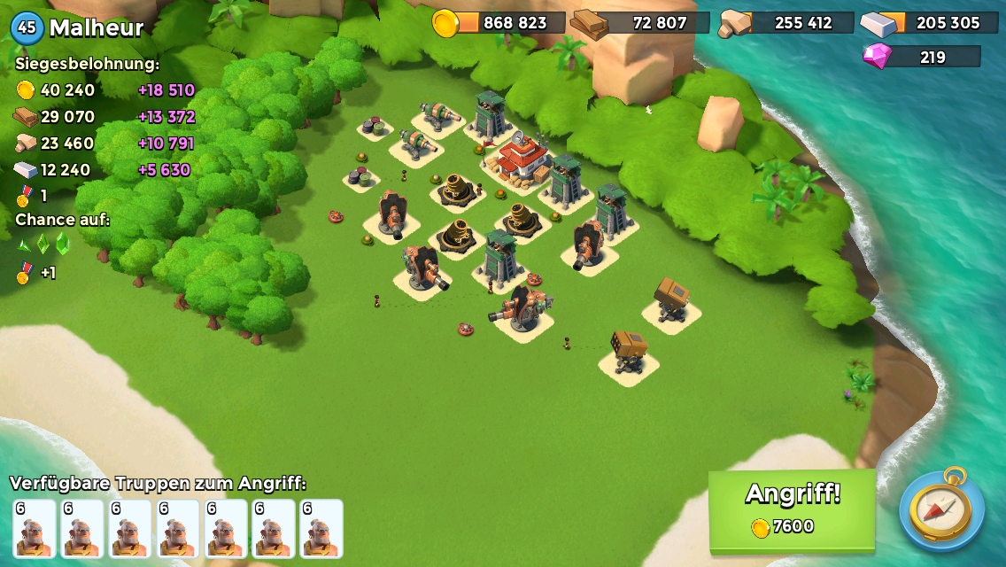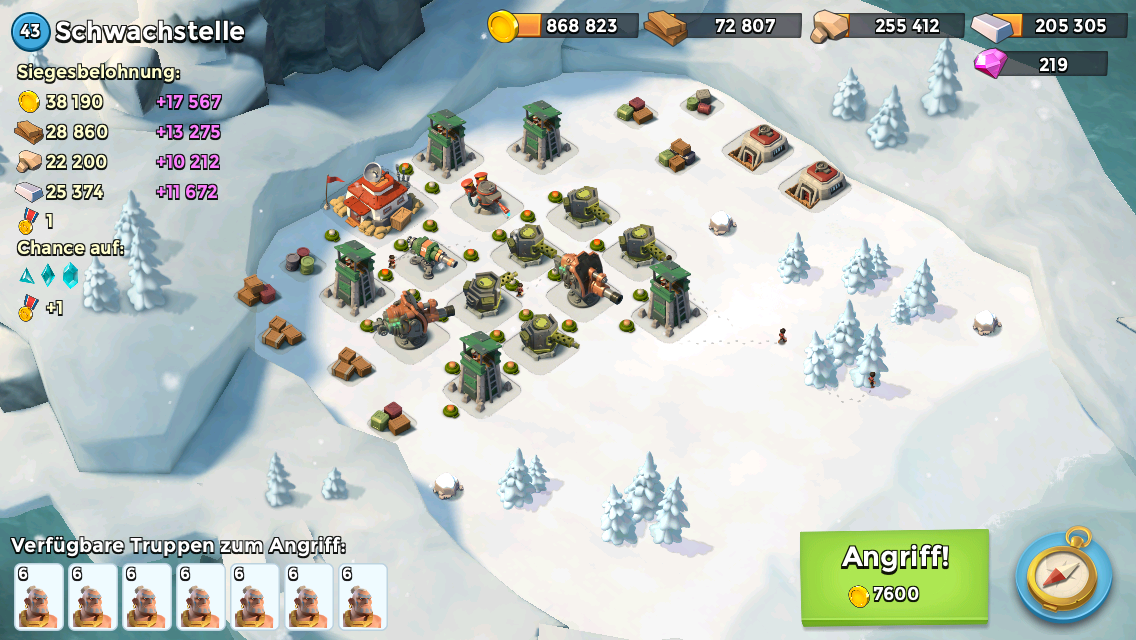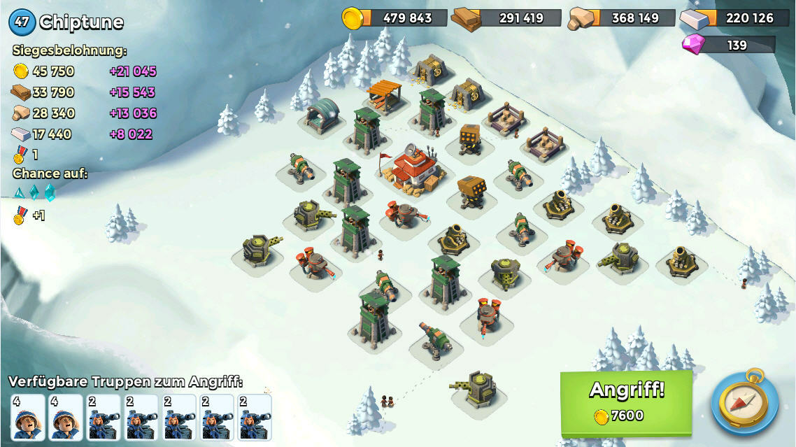 und natürlich dem mittlerweile obligatorischen HQ Lv. 20 (140.000)Bis jetzt bin ich da immer mit Brachialgewalt rein und links die Boom und die Kanonen-Gruppe sowie den Turm rechts vom HQ ausgeräumt. Das geht nun bei der Stärke nicht mehr, dafür reicht die Energie nicht.