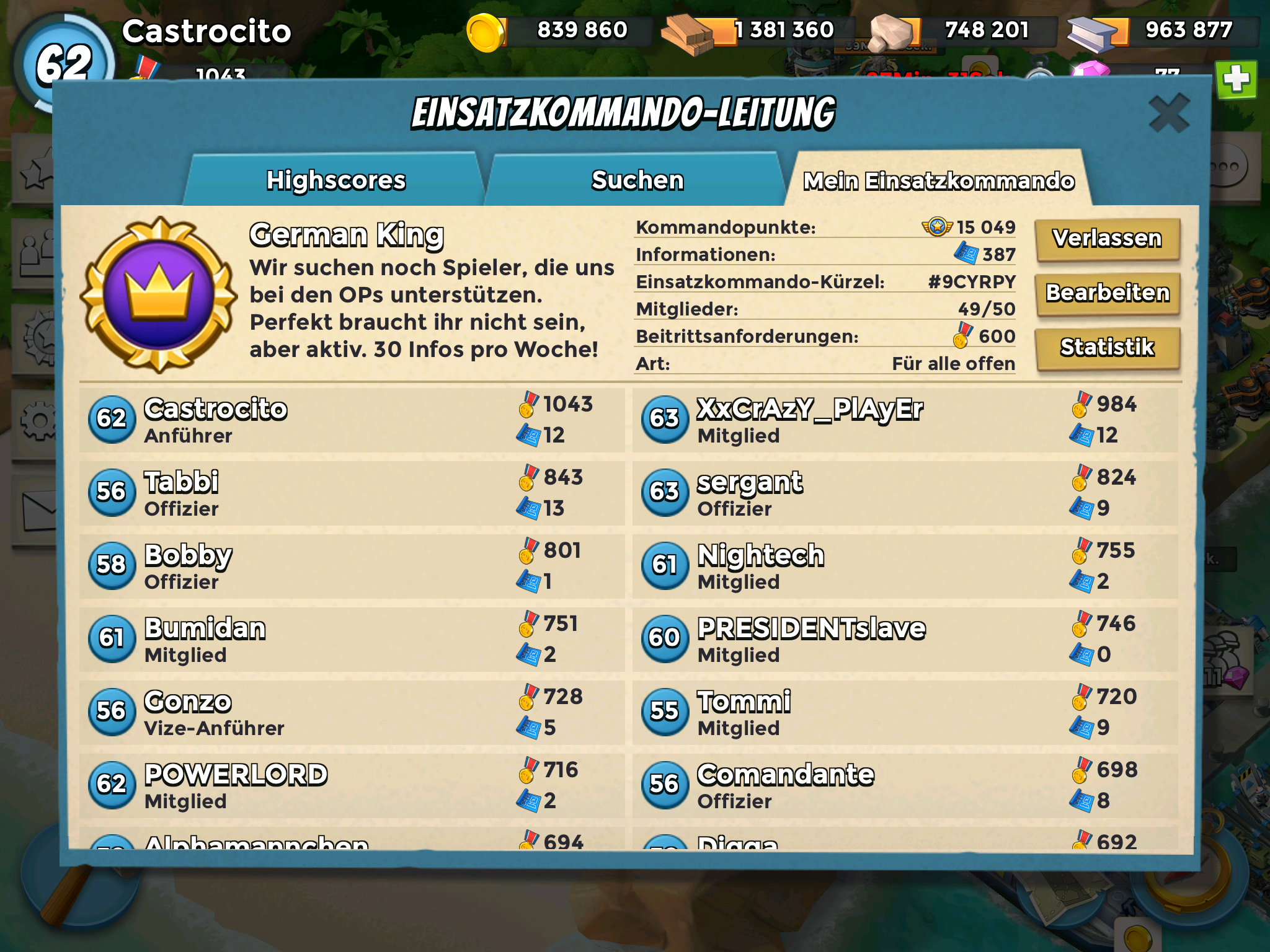 Wir liegen momentan bei ca. 14800 Kommandopunkte und machen momentan Foxtrot und Festung im Wechsel. Für Foxtrot benötigen wir ca. 20-30 Angriffe und für Festung 30-40 Angriffe. Für Engpass bekommen wir nicht genug Angriffe zusammen.