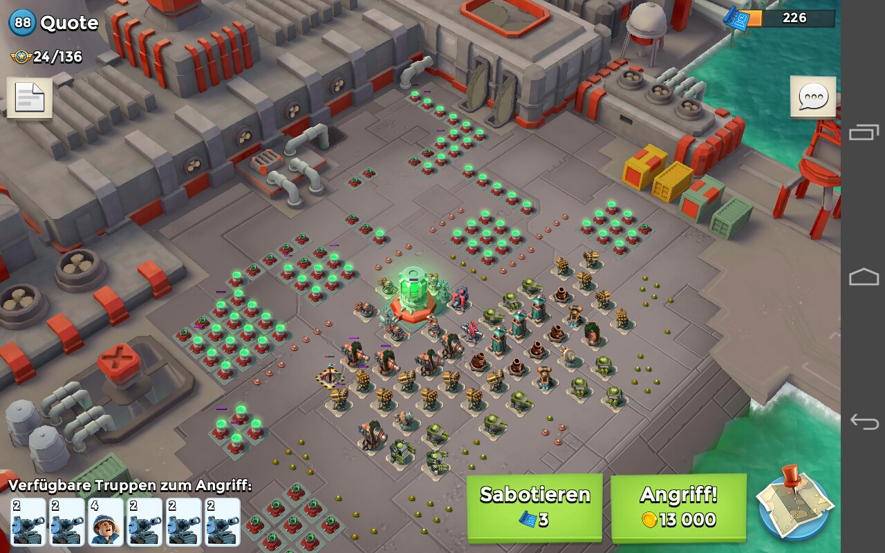 als unser Kommando im Aufbau war, haben wir uns auch immer an Quote die Zähne ausgebissen. Zu der Zeit haben die meisten mit SG und Zookas angegriffen. Die wenigsten mit Panzer/Sanis, da diese noch nicht so weit aufgelevelt waren. Glücklicherweise hatten wir auch drei Spieler, die ihre Truppen voll aufgelevelt hatten. Heute lösen wir Quote meistens mit Panzer.