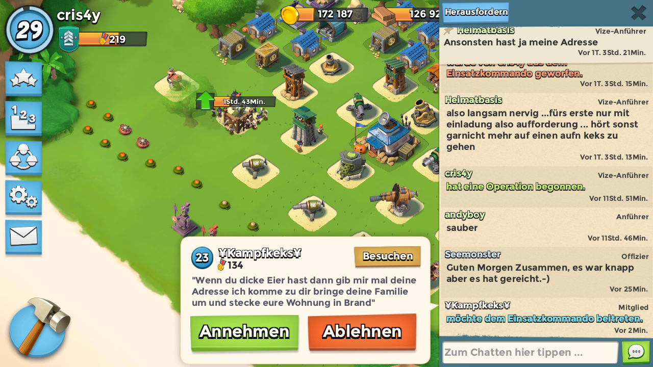 trotz melden wurde Spieler nicht gesperrt und belästigt Spieler jetzt haben wir nur noch auf Einladung neue Mitglieder und beim Versuch wieder rein zu kommen schickt er wieder Drohungen was tun ... Habe mal Beispiel in Ablage gelegt damit mal sehen könnt wie der abgeht kann doch nicht sein das man da nix tun kann.... Bitte um Hilfe.