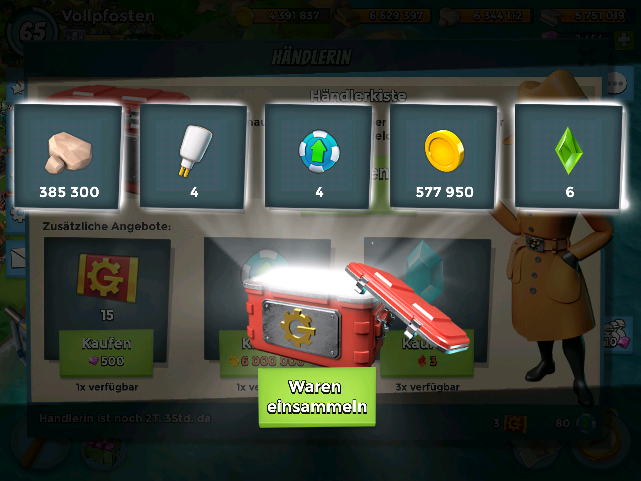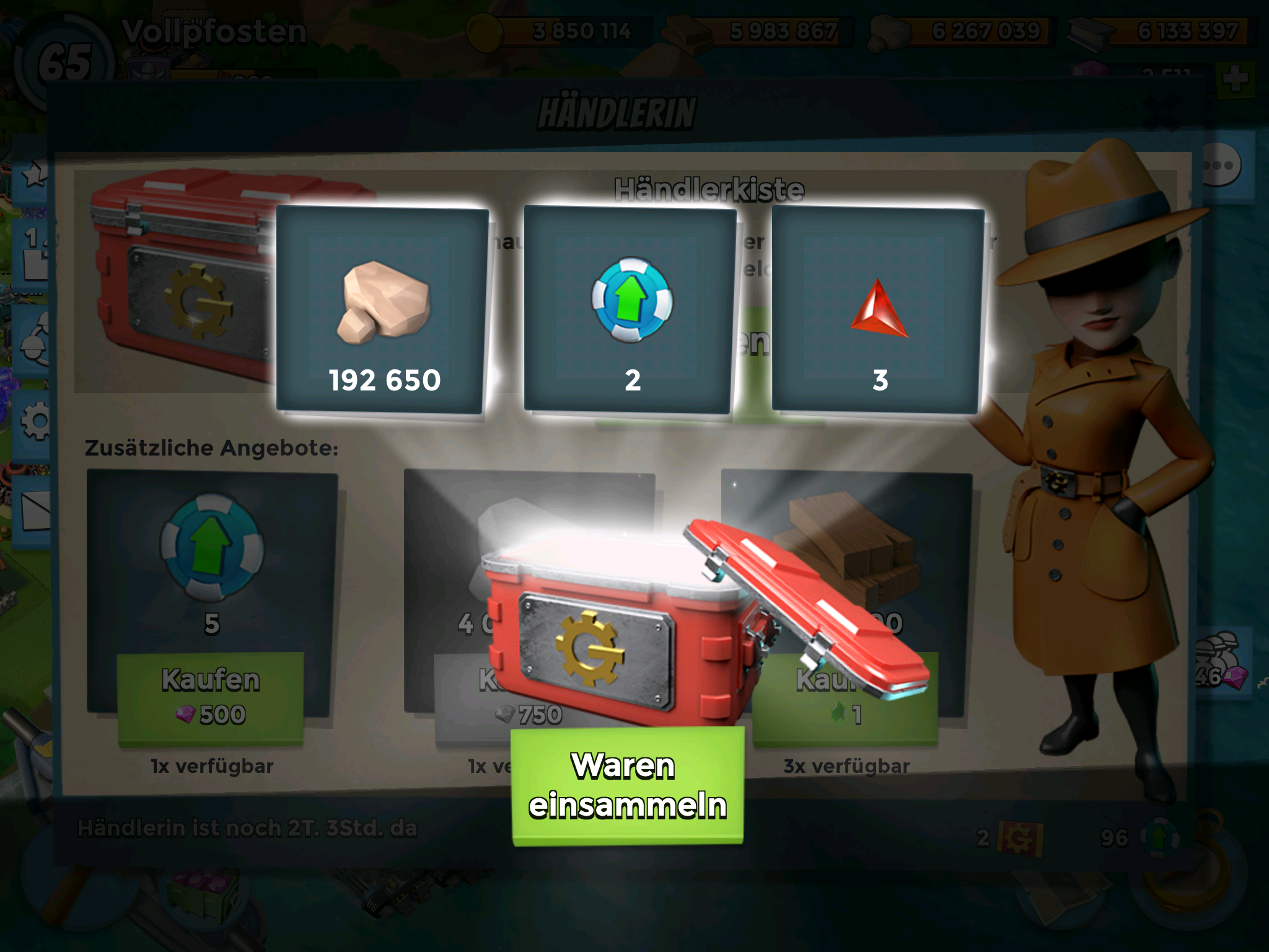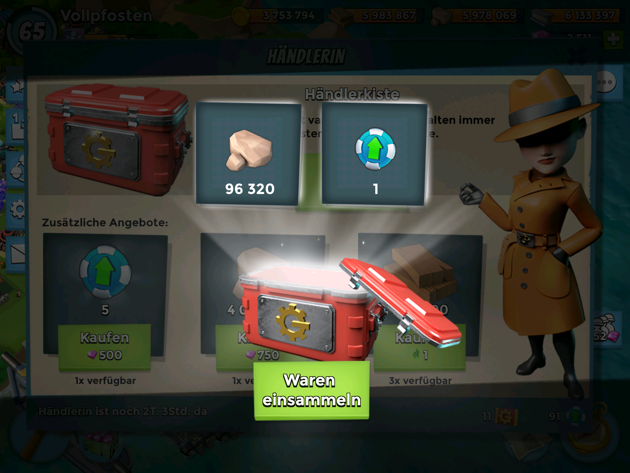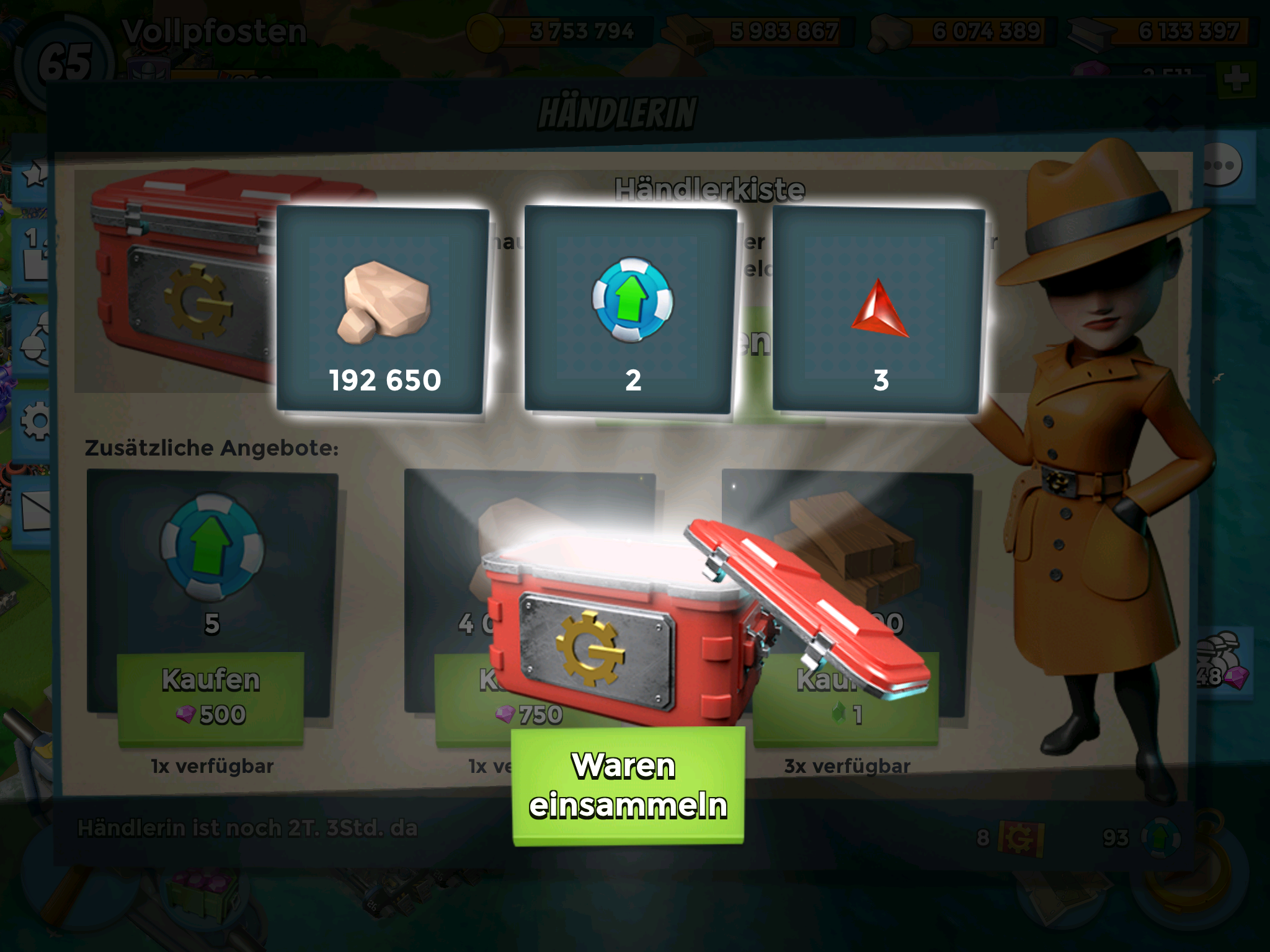 Wenn man 3 Händertickets bezahlt und die Marken rechts unten im Blick behält sieht man unmittelbar, dass sich die Zahl der Marken erhöht, dann öffnen sich erst die Kisten auf dem Bildschirm.