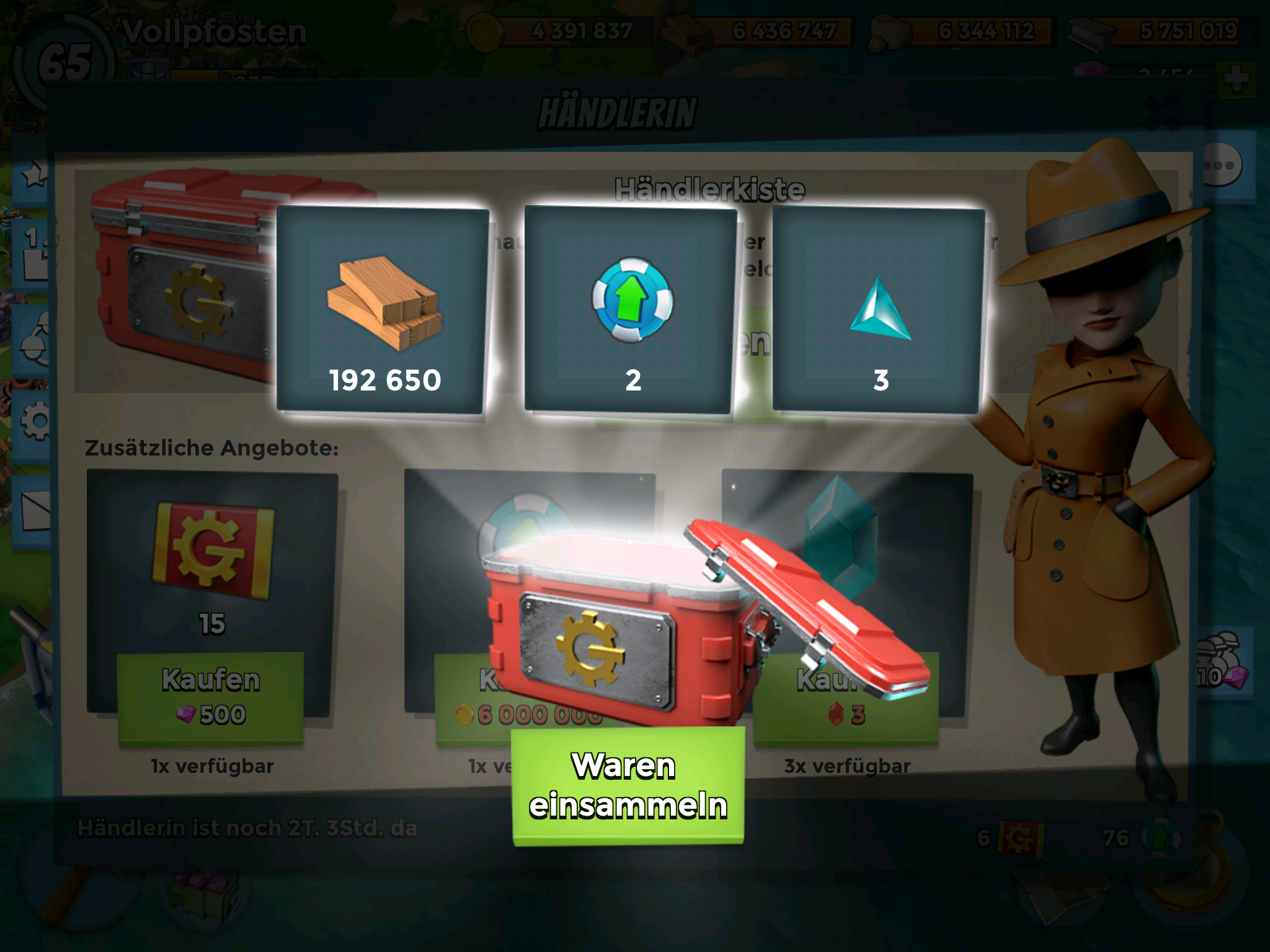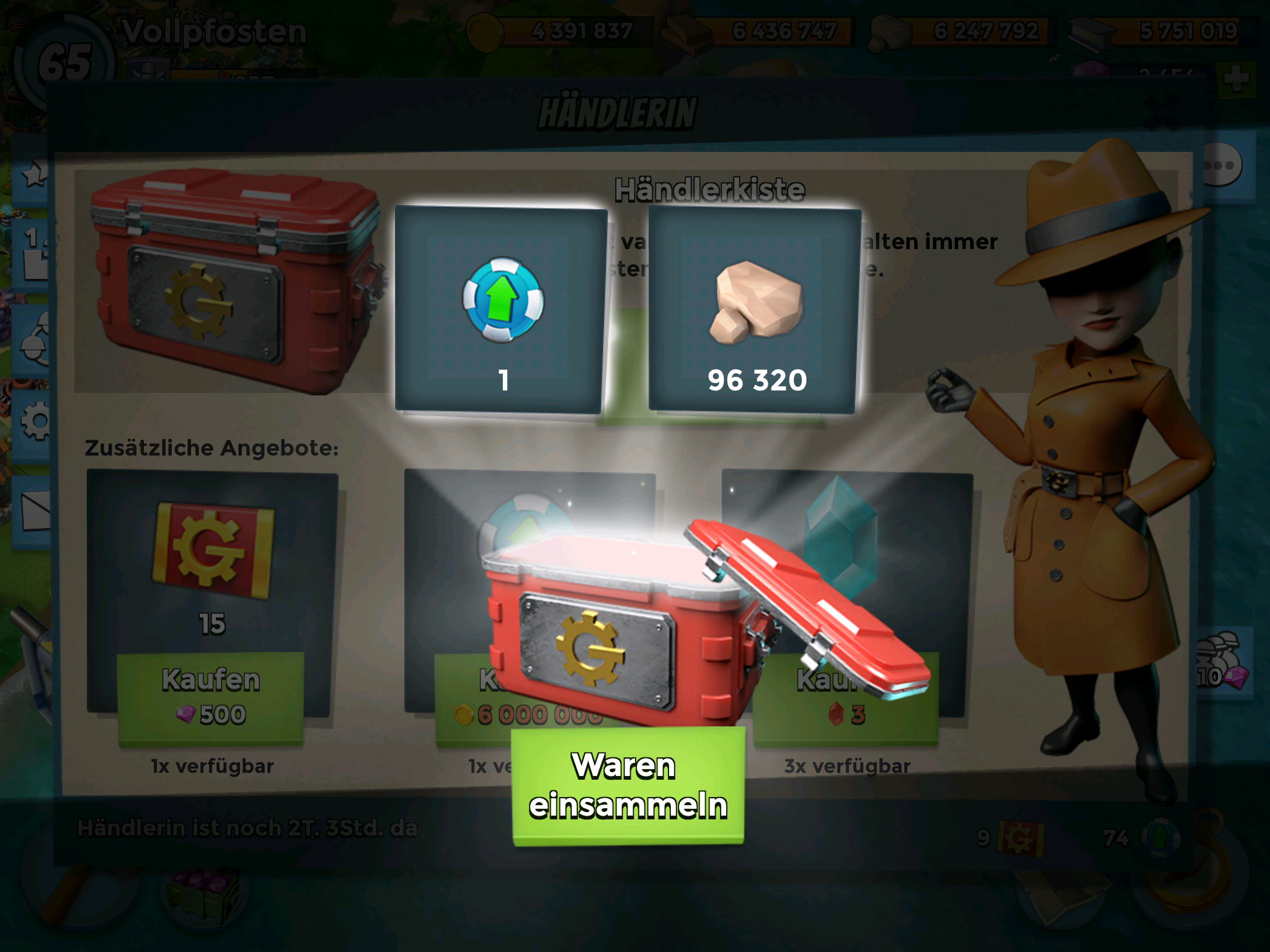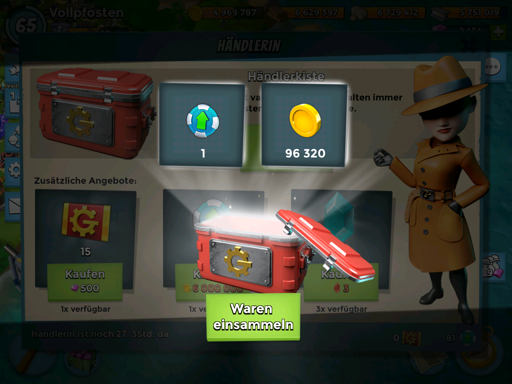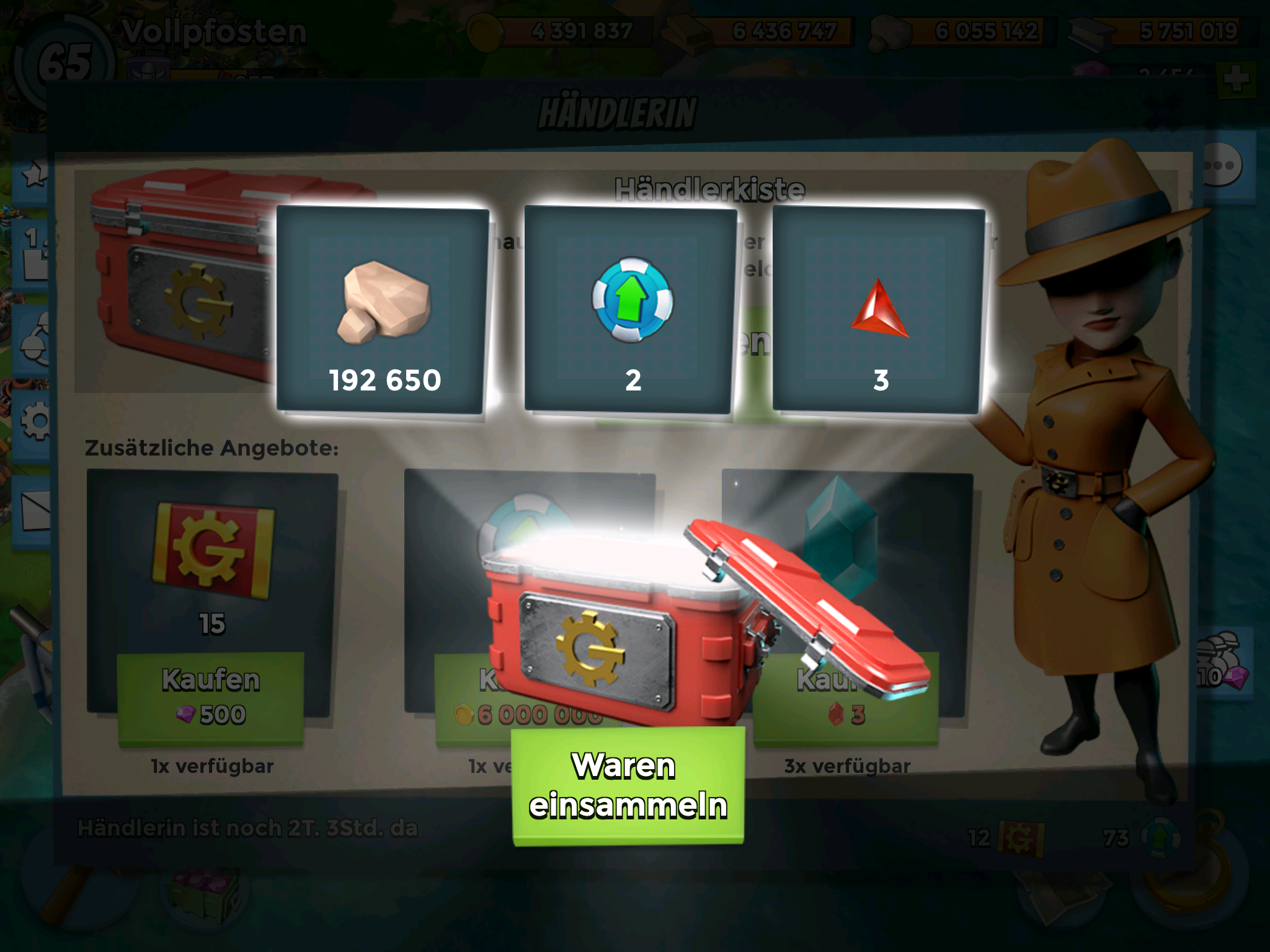 Wenn man 3 Händertickets bezahlt und die Marken rechts unten im Blick behält sieht man unmittelbar, dass sich die Zahl der Marken erhöht, dann öffnen sich erst die Kisten auf dem Bildschirm.