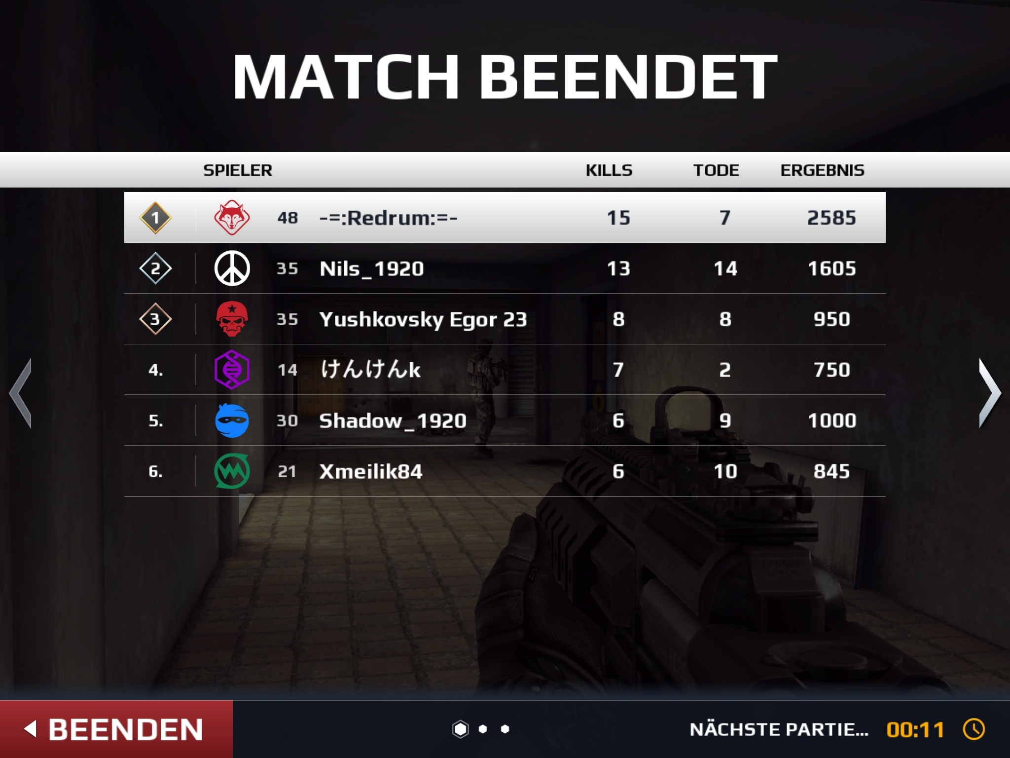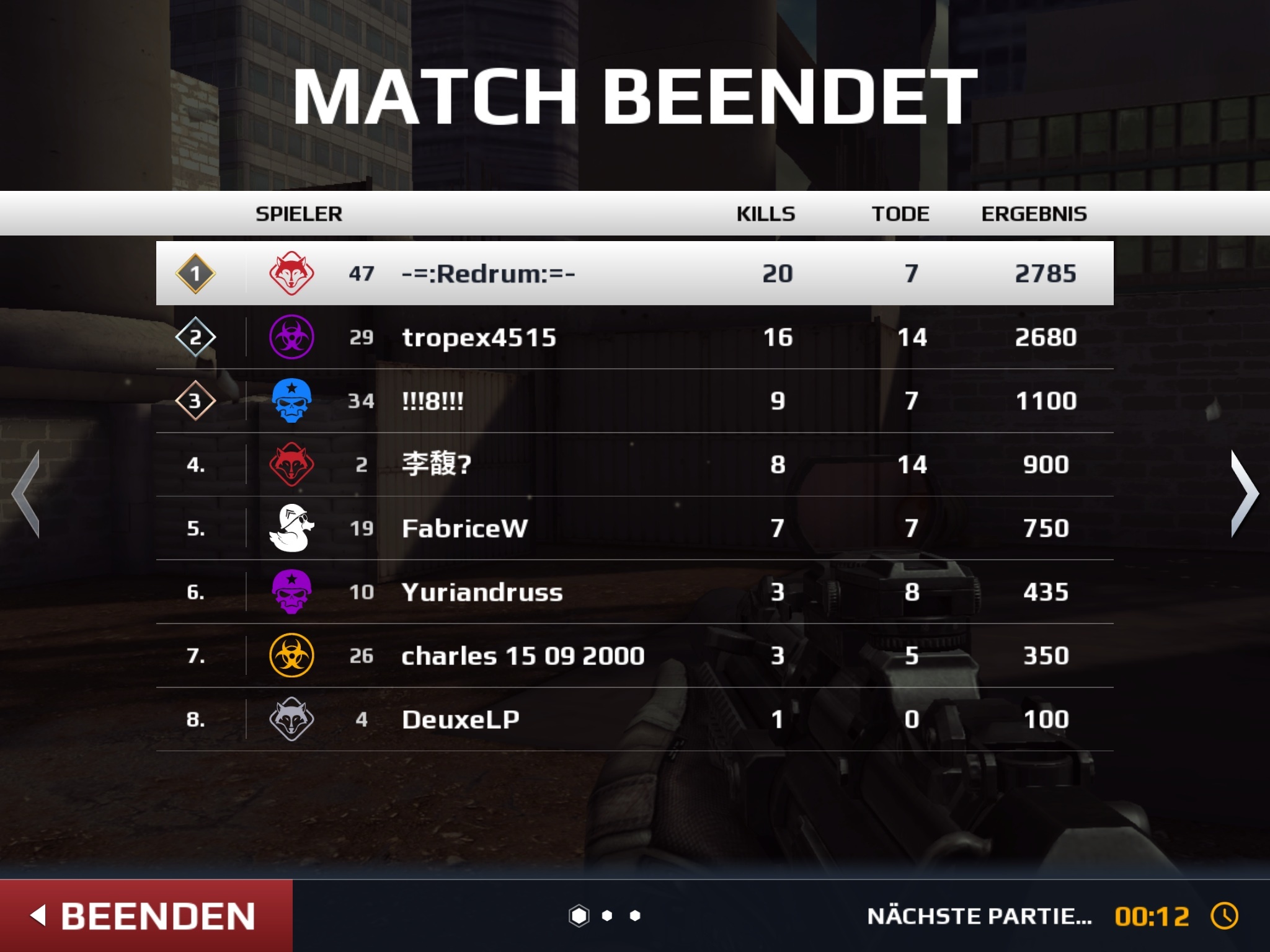 In Modern Combat 4 war VIP zum Punkte sammeln sehr gut. Im 5er hat sich jeder gegen jeden als sehr effektiv erwiesen. Da ich die Sturmeinheit quasi durch habe und die RED mir irgendwie zu lame ist, hab ich gestern den Scout gepusht. Sehr geil: hab jetzt schon die Stufe 5 Waffe mit massig Zubehör. Seit dem ich den Scout spiele hat sich meine Kopfschussbilanz deutlich verbessert :D :D :D