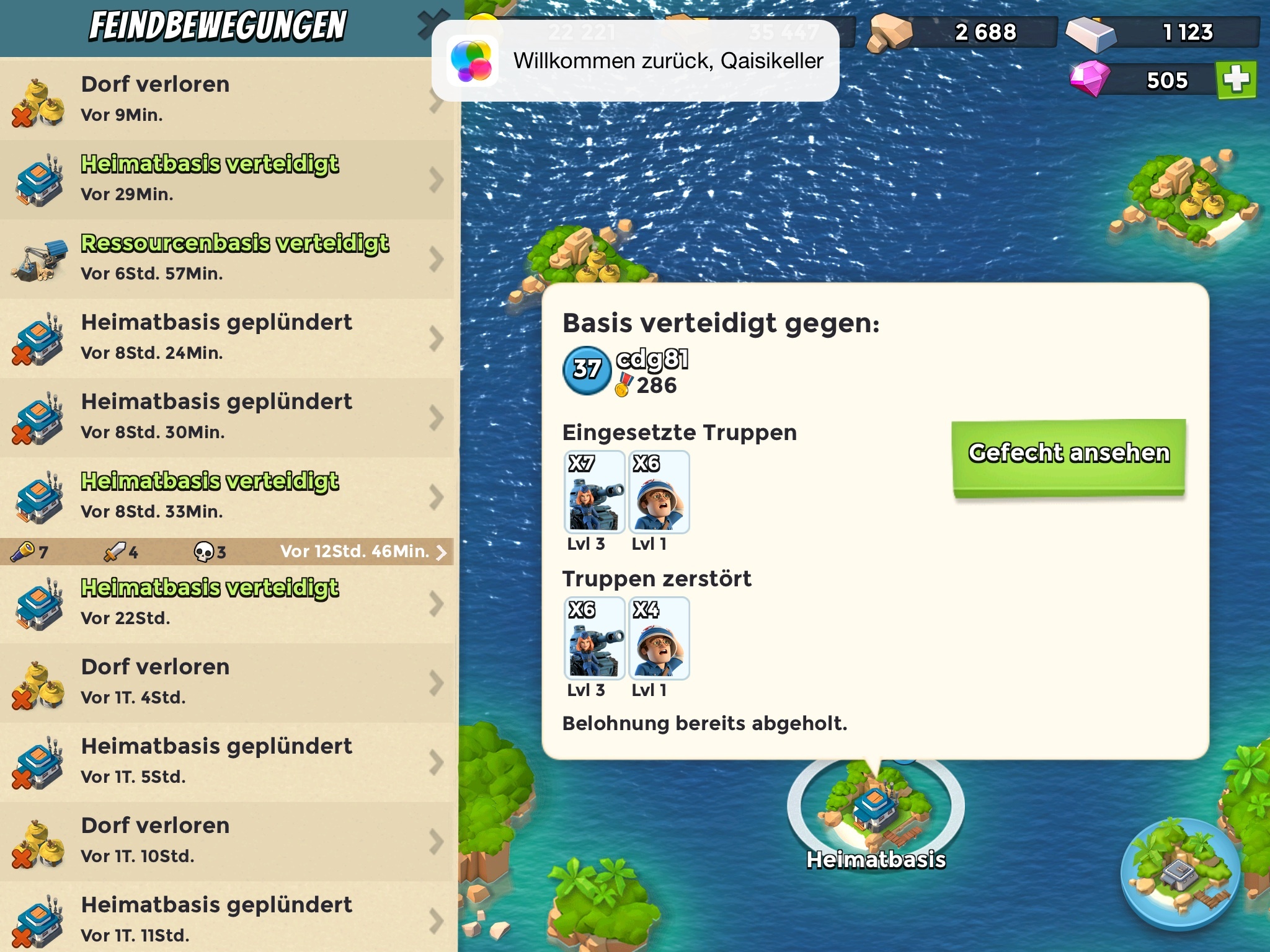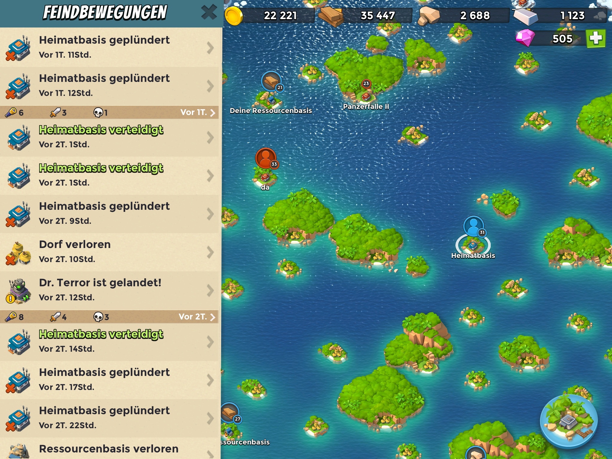 - Eisenlagerum mich auf den morgigen Besuch vorzubereiten. Ich greife nur das Nötigste an und sicher mir ein paar schöne Gegner auf der Karte, um meine Ressourcen voll zu bekommen. Es passen nun 8 Panzer an Bord und ich rechne mir gute Chancen aus, diesmal mit irgendeiner Kombi weiter zu kommen. Und wenn nicht, dann müssen eben andere dran glauben