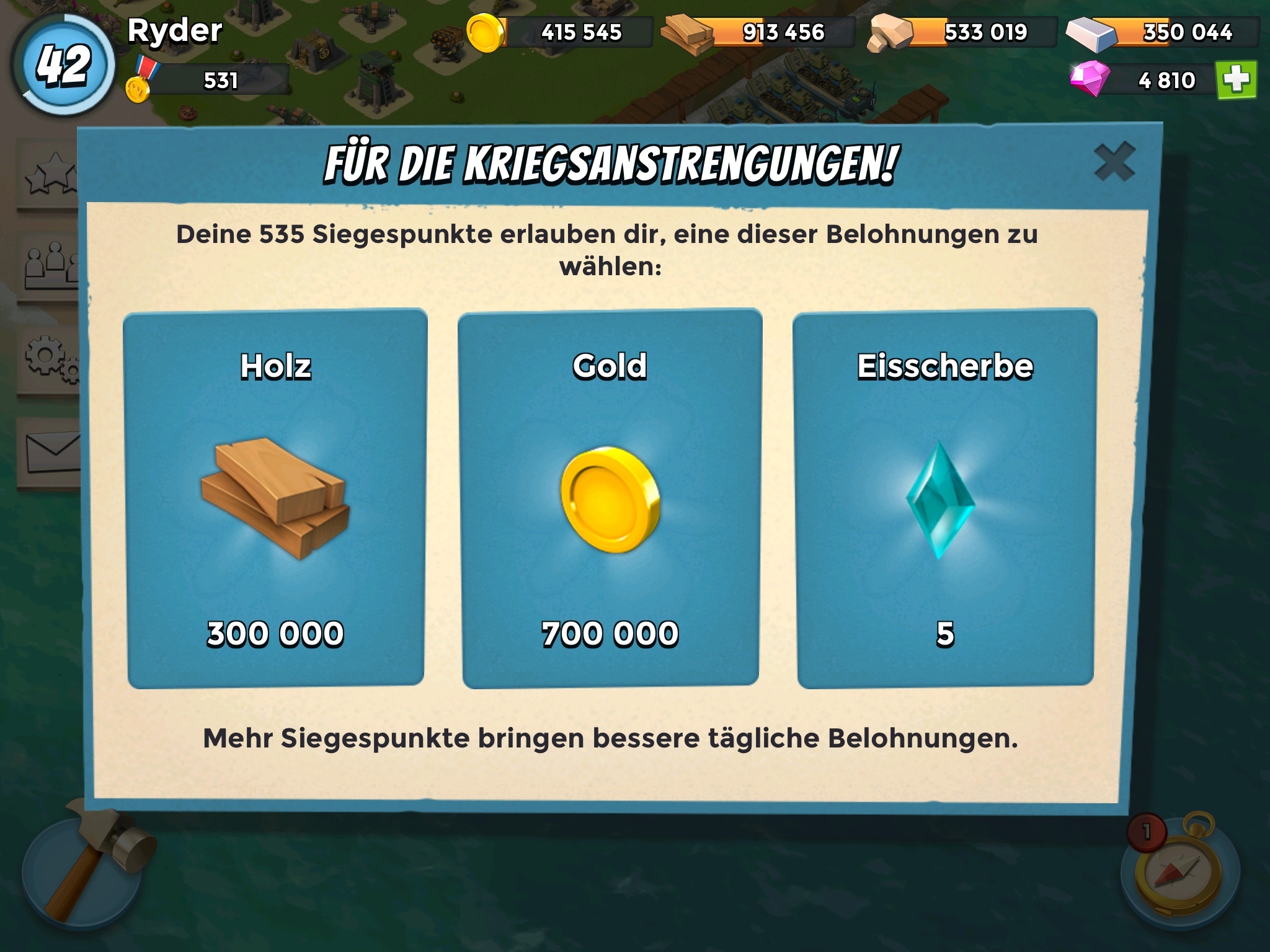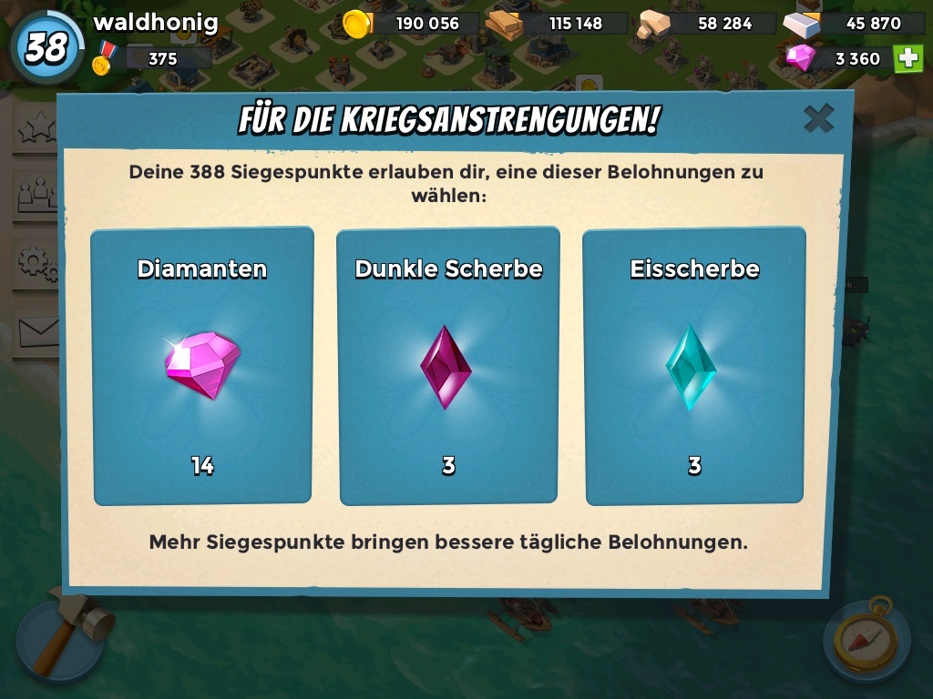 Hatte jetzt die letzten Tage immer so um die 450 Medaillen (war aber nie exakt gleich - immer so um 4-8 Differenz). Es war immer was komplett anderes drin: mal 4 dunkle Scherben, mal blaue, mal verschiedene zur Auswahl, manchmal gar keine und dafür 14 Diamonds, und an Ressourcen auch wahlweise Holz, Stein und Eisen.